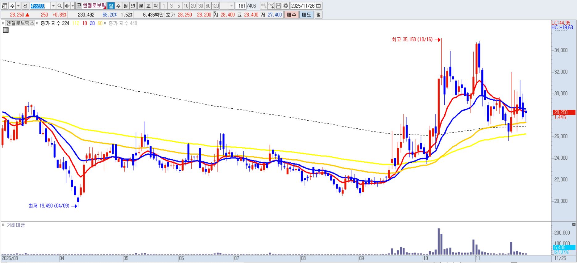 그러나 잠재적 위험 요소로는 혁신 기업 특성상 단기적인 손실이 불가피한 구조적 적자 상태가 지속되고 있다는 점이며, 장기 성장을 위한 대규모 투자 비용과 로봇 산업 내 경쟁 심화에 따른 기술적 우위를 지속해야 하는 부담이 있습니다. 또한, 공모 과정에서 제기되었던 공모가 고평가 논란 등 시장의 우려도 리스크로 남아있습니다. 32,000원 부근에서 정리 가능합니다. |