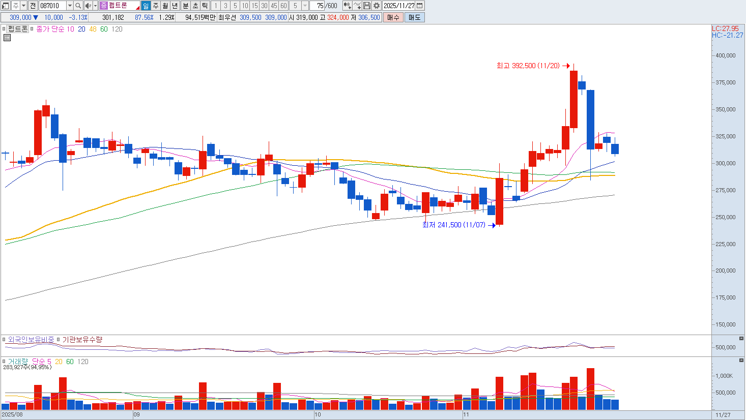 그러나 잠재적인 위험 요소로는 바이오 신약 개발 기업의 본질적인 불확실성이 가장 큽니다. 비록 글로벌 제약사와의 기술 평가가 진행 중이지만, 최종적인 본계약 체결 여부가 불투명하며, 이와 관련된 불확실성이 시장의 부담으로 작용하고 있습니다. 또한, 동사는 기술성장기업 특례로 상장한 후 단기 매출액 규모가 작아 관리 종목 지정 및 상장 폐지 요건에 대한 우려에서 완전히 벗어나지 못하고 있습니다. 향후 대규모 연구 개발과 신약 상업화를 위한 지속적인 자금 조달 필요성은 기존 지분 가치 희석이라는 잠재적 리스크로 이어질 수 있습니다. 30만원은 중요 지지라인입니다. |