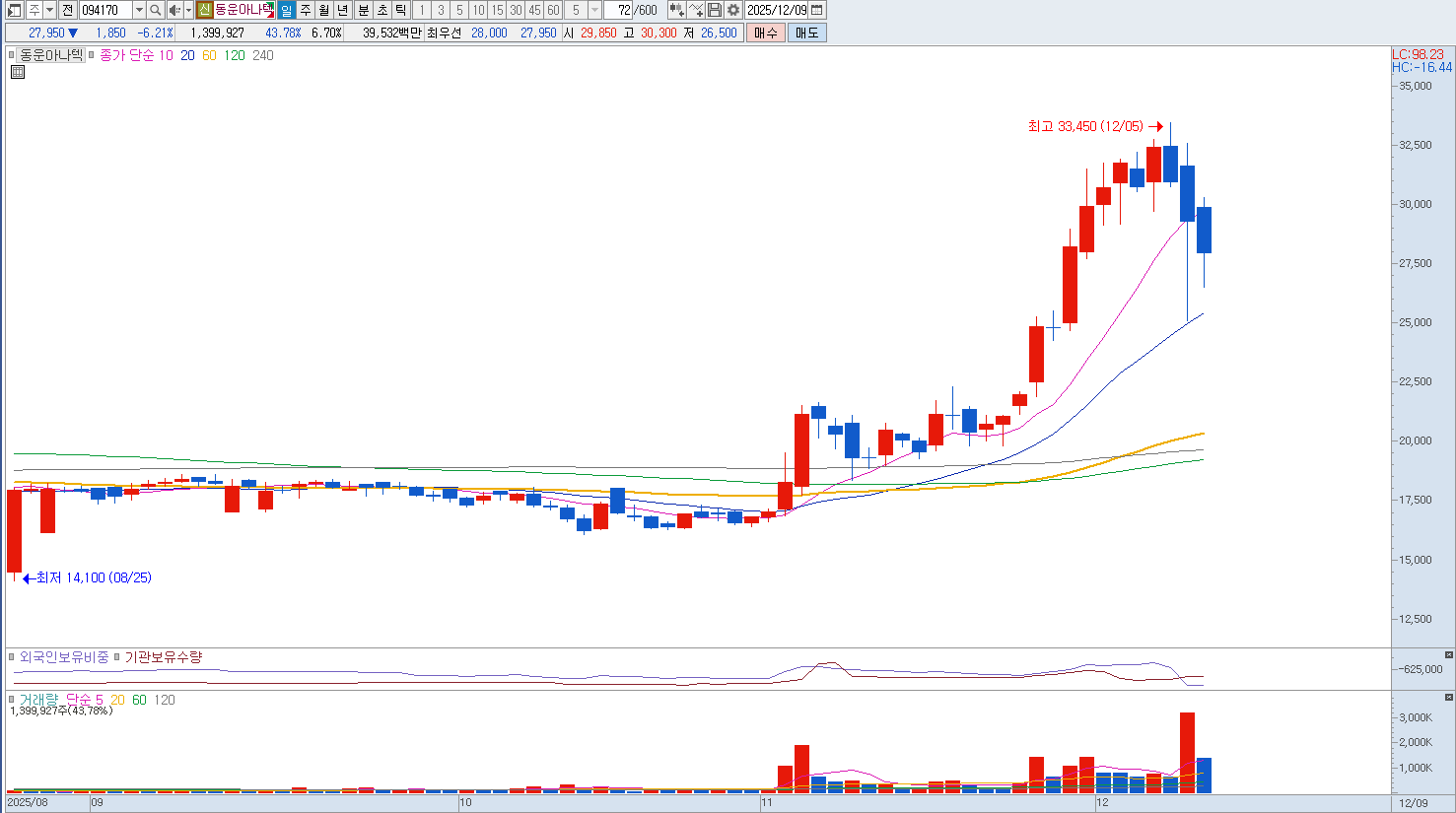 동운아나텍의 가장 주목할 만한 신사업은 스마트 헬스케어 기기 시장 진출입니다. 동사는 미세 전류를 이용한 침습적이지 않은 혈당 측정 기기 등 혁신적인 의료 기기를 개발하며 바이오/헬스케어 분야로 영역을 확장하고 있습니다. 이는 기존의 반도체 설계 기술을 바이오 신호 측정 및 제어 분야에 융합한 결과물로, 성공적으로 상업화될 경우 새로운 성장 축을 형성할 잠재력을 가지고 있습니다. 다만, 의료 기기 시장은 각국 규제 당국의 까다로운 인증 및 임상 절차가 필수적이므로, 상업화까지는 상당한 시간과 투자가 필요하며, 관련 리스크를 감수해야 합니다. 중요 지지라인은 26,500원입니다. |