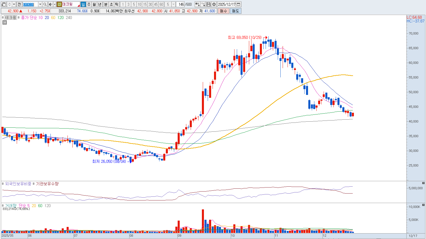 업황 하강 국면에서는 실적 하락 리스크에 직면할 수 있습니다. 또한 차세대 검사 기술 변화에 대한 대응 속도가 늦어질 경우 해외 경쟁사들에게 시장 지배력을 잠식당할 우려가 상존하므로 지속적인 연구개발을 통한 기술 격차 유지가 필수적인 과제입니다. 중요 지지선은 40,000원입니다. |