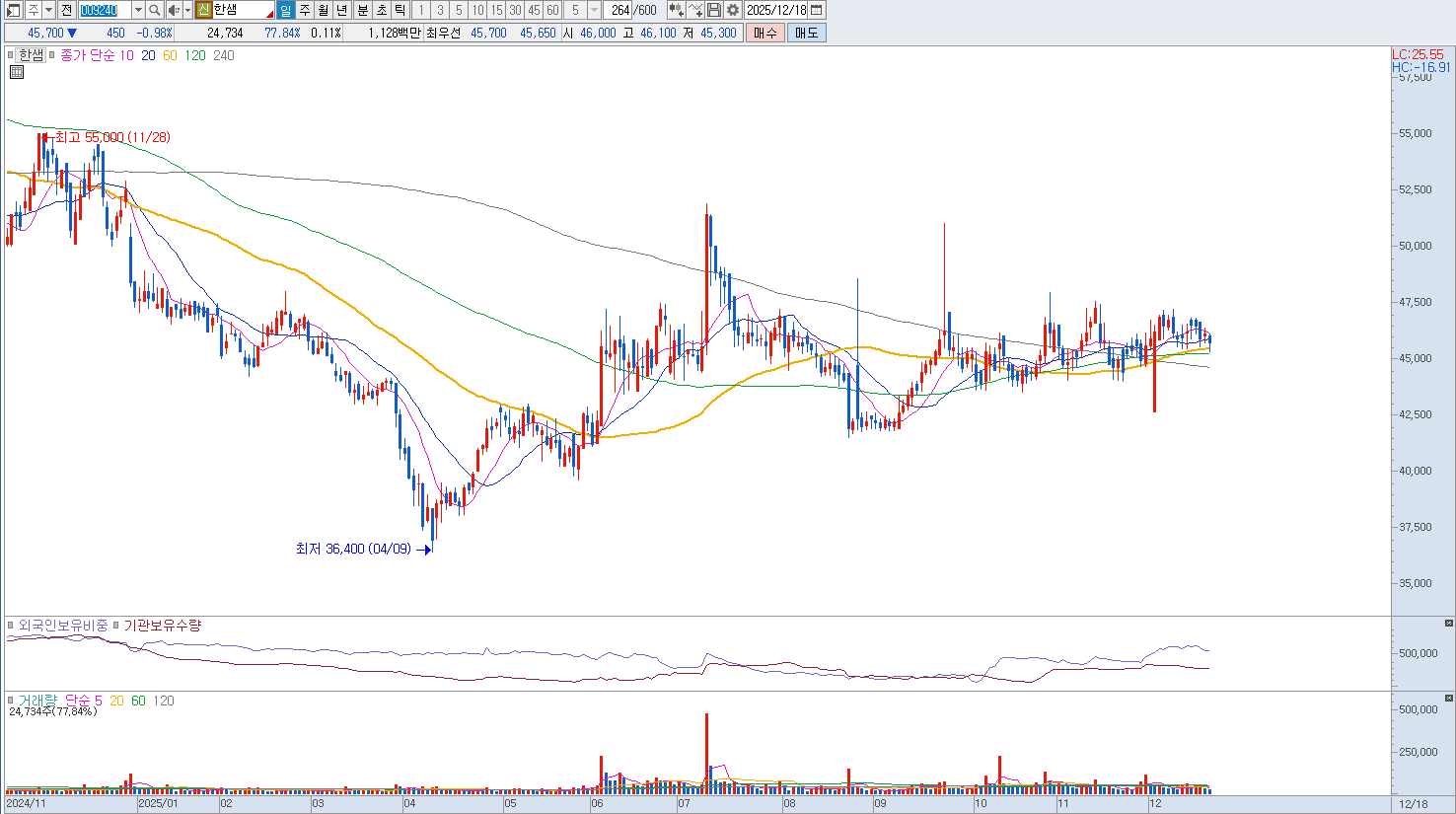 특히 최근에는 오프라인의 강점을 온라인으로 이식하는 디지털 플랫폼 '한샘몰'의 고도화를 통해 고객과의 접점을 넓히고 가상 현실 기반의 설계 서비스를 제공하며 소비자 편의성을 극대화하고 있습니다. 다만 부동산 경기 침체와 거래량 감소가 인테리어 수요에 직접적인 영향을 미치는 산업 특성상 대외 경제 변수의 회복 시점에 따라 기업 가치의 반등 폭이 결정될 것으로 보입니다. 중요 지지라인은 43,000원입니다. |