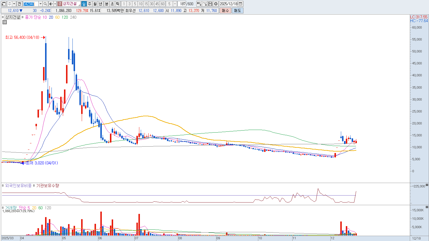 하지만 이러한 브랜드 파워에도 불구하고 현재 상지건설은 고금리와 부동산 경기 침체라는 거시적 환경의 압박으로 인해 재무적 체력이 상당히 약화된 상태에 놓여 있습니다. 지속적인 영업손실로 인한 적자 구조가 고착화되면서 현금 흐름이 악화되었고 과거 발행한 전환사채의 상환 부담과 이자 비용 지출은 기업 운영에 상당한 리스크 요인으로 작용하고 있습니다. 특히 주가가 기업의 본질적 가치보다는 특정 정치적 이슈나 테마에 엮여 급격한 변동성을 보이는 경향이 강해 투자자들에게는 실질적인 펀더멘털 개선 여부를 면밀히 관찰해야 하는 숙제를 안겨주고 있습니다. 반등시마다 비중 축소 의견입니다. |