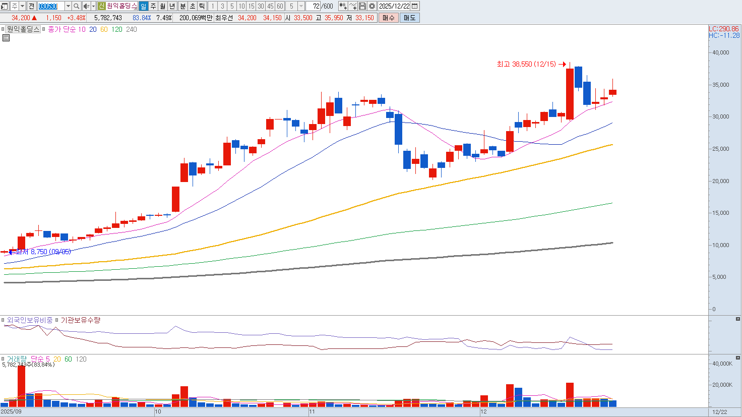 원익홀딩스는 그룹 내 지주사로서 자회사들의 사업 포트폴리오 관리에 주력하고 있으나 지주사 특유의 밸류에이션 저평가 현상과 지배구조 개편에 따른 불확실성이 상존하며 투자자들의 심리를 위축시키고 있습니다. 원익아이피스와 원익큐엔씨 등 핵심 계열사들의 기술적 성과가 지주사의 가치로 온전히 전이되지 못하는 구조적 한계가 뚜렷하며 이는 주가 상승 동력을 제약하는 요인이 됩니다.