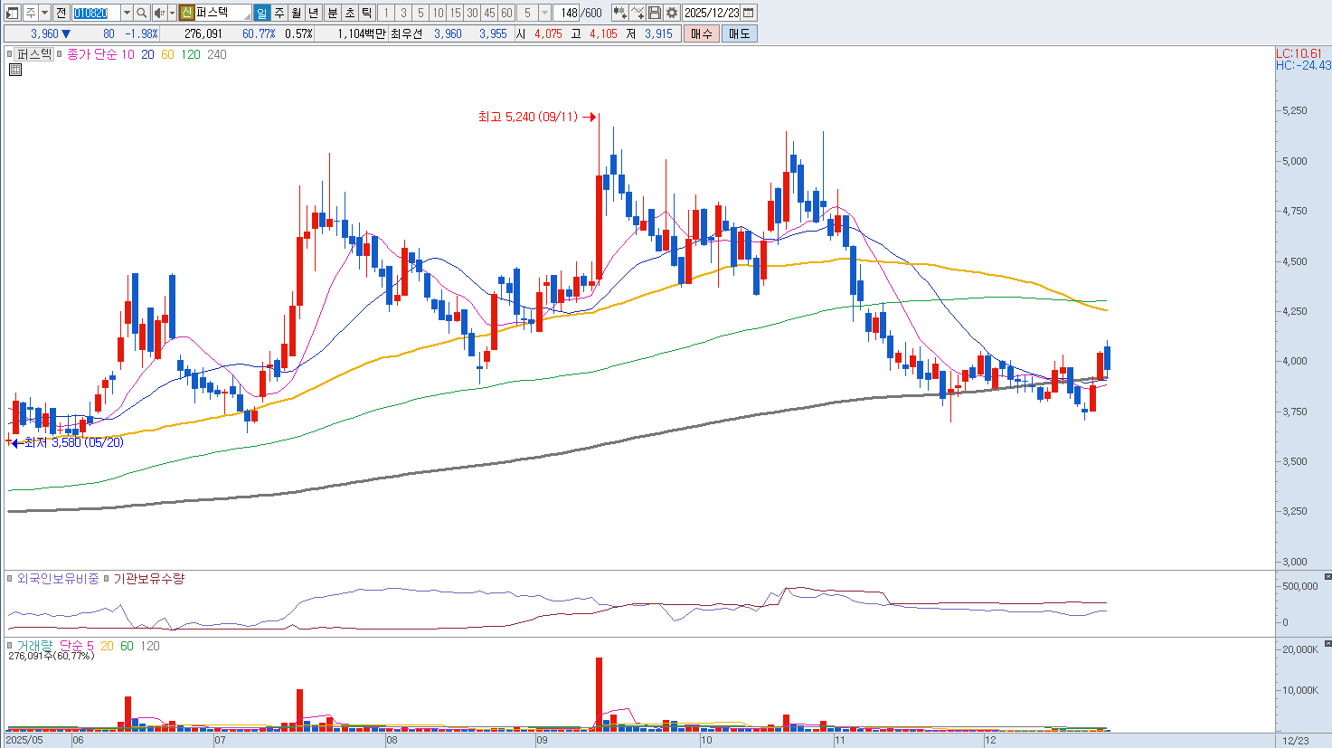 2. 부정적 측면 및 리스크 요인 2025년 상반기 영업이익이 전년 대비 444% 급증하며 실적 턴어라운드에는 성공했으나, 여전히 약 453%에 달하는 높은 부채 비율은 재무 건전성 측면에서 반드시 해결해야 할 숙제로 남아있습니다. 기술적 분석상으로도 주가가 단기적인 하락 압력을 받고 있으며, 주요 지지선(약 4,200원대)을 확고히 지지하지 못할 경우 변동성이 커질 수 있다는 점에 유의해야 합니다. 또한 증권사 리포트가 드문 소형주 특성상 정보의 비대칭성이 크고, 글로벌 공급망 불안에 따른 원자재 가격 변동이 제조 원가에 즉각적인 압박을 가할 수 있는 구조적 취약점이 존재합니다. 중요 지지라인은 3,850원입니다. |