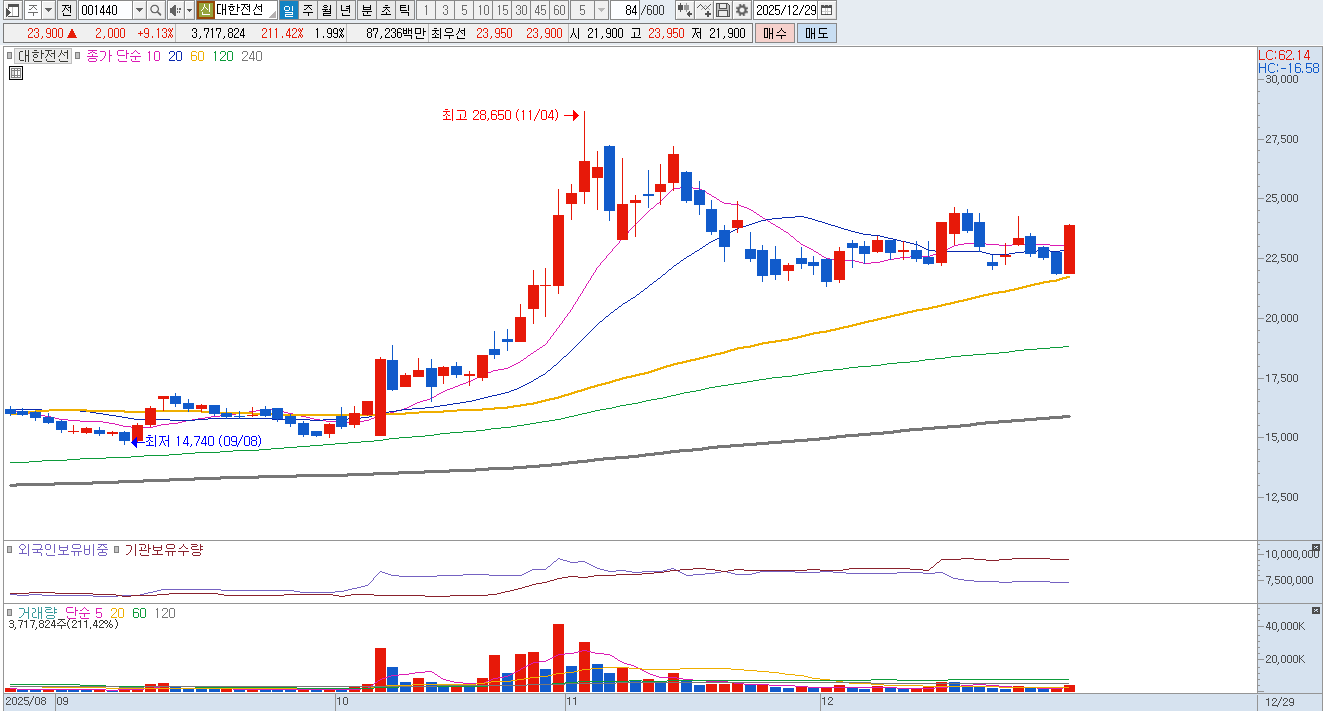 최근 구리 가격 변동성이 심화되면서 원재료 가격 전가력에 대한 의문이 제기되고 있으며 글로벌 경쟁사들이 북미와 유럽 시장 점유율 방어를 위해 공격적인 단가 입찰을 진행함에 따라 대한전선의 수주 수익성이 과거보다 낮아질 가능성도 배제할 수 없습니다. 수급 측면에서도 연말 대주주 양도세 회피 물량은 일단락되었으나 장기 보유 중인 기관 투자자들이 신규 공장의 실적 기여도를 확인하기 전 차익 실현에 나설 가능성이 높아 주가의 추가 탄력보다는 횡보나 조정의 무게가 실리고 있습니다. 따라서 실질적인 이익 성장이 증명되기 전까지는 고점 부근에서의 비중 축소 전략이 유효해 보입니다. 매도의견입니다. |