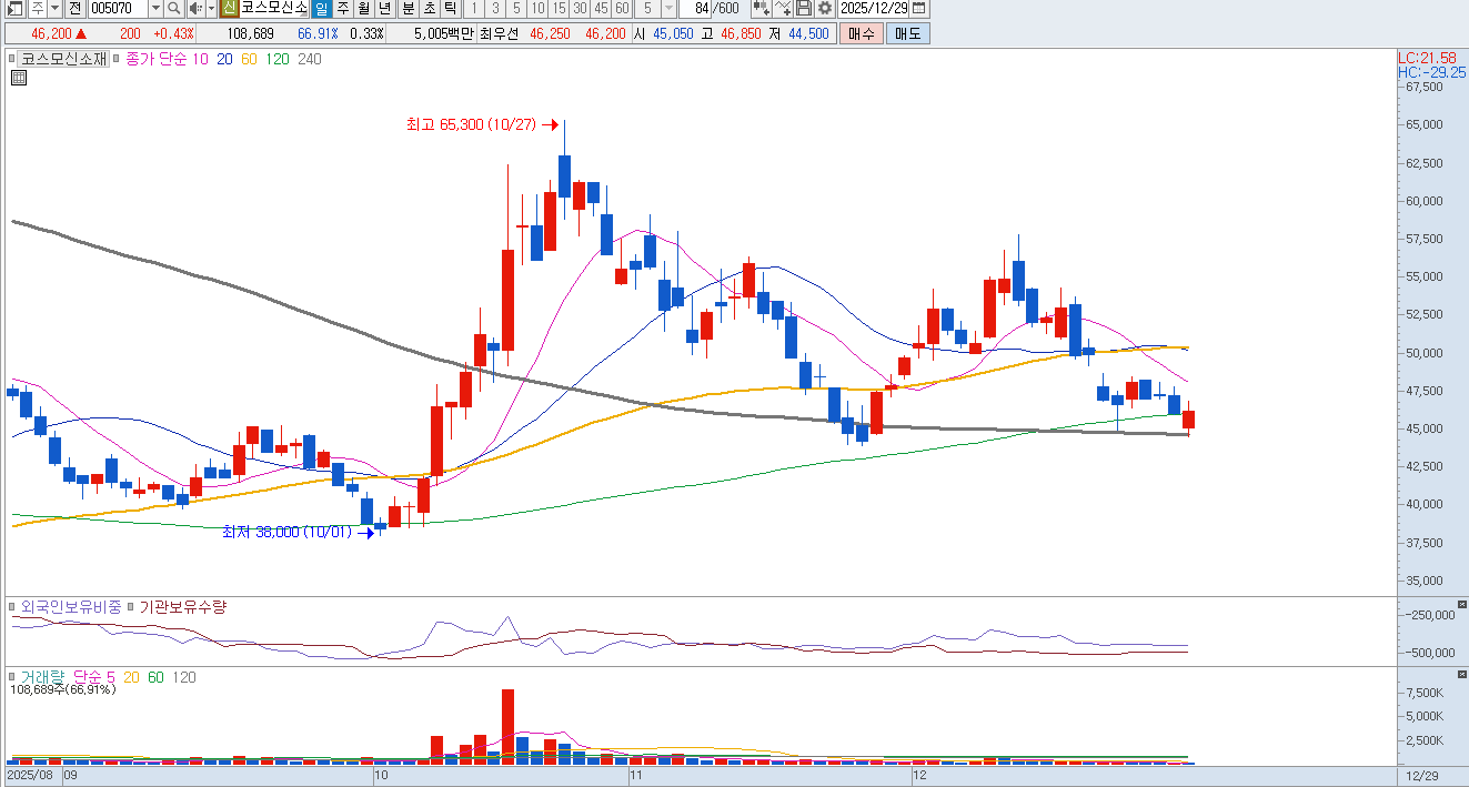 코스모신소재는 이차전지 양극재 시장의 핵심 주자로 평가받지만 전기차 캐즘(Chasm) 현상이 예상보다 길어지면서 공장 가동률 저하와 재무 부담 증가라는 이중고에 직면해 있습니다. 현재 양극활물질 부문의 가동률은 10%대 초반에 머물러 있는데 이는 과거 공격적인 증설 투자에 따른 설비 유휴화 리스크를 극명하게 보여주는 지표이며 이로 인해 발생하는 고정비 부담은 손익분기점(BEP) 달성을 지연시키고 있습니다. 특히 지난해 대규모 투자 완료 후 이자 비용이 전년 대비 10배 이상 폭증하며 현금 흐름을 압박하고 있으며 전방 산업인 전기차 수요 회복 시점이 2026년 이후로 밀릴 것이라는 전망이 나오면서 밸류에이션 부담이 가중되고 있습니다.