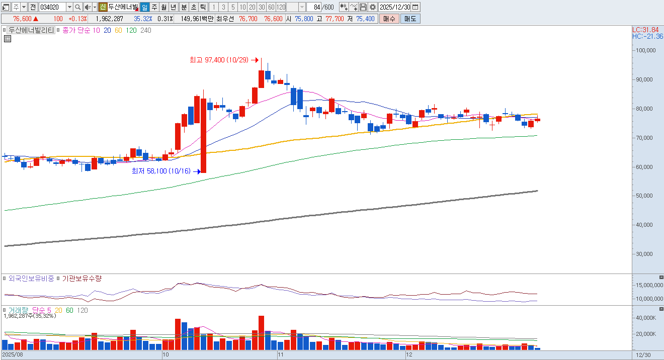 두산에너빌리티는 대형 원전 및 SMR(소형모듈원전) 수주 기대감으로 주가가 역사적 고점 부근에서 등락을 반복하고 있으나 실제 수주 계약이 매출로 인식되기까지 발생하는 상당한 시차와 더불어 잉여현금흐름(FCF) 적자 지속에 따른 재무적 부담이 단기적인 차익 실현 욕구를 자극하고 있습니다.