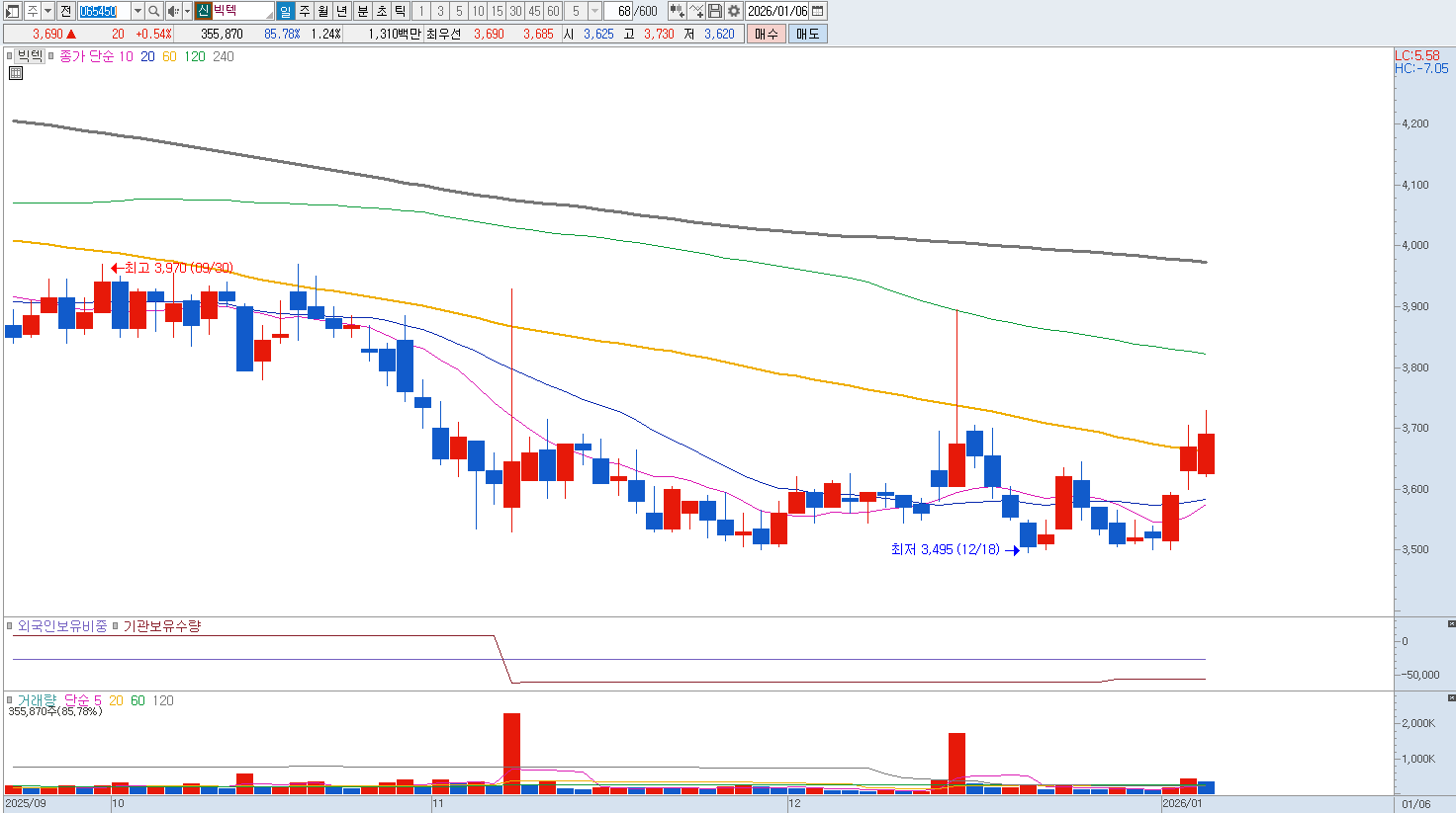 방산 섹터의 수혜가 대형 수출주 위주로 재편되면서 중소형주인 빅텍에 대한 시장의 관심도가 현저히 낮아졌고 이동평균선들이 역배열 상태에서 데드크로스를 형성하고 있어 기술적으로도 추가 하락의 위험이 큽니다.