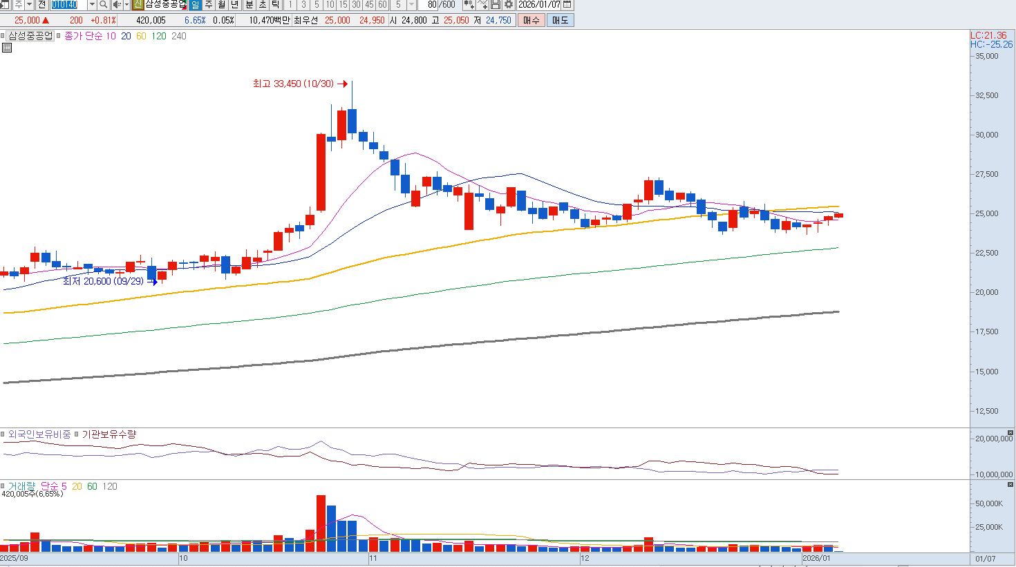 삼성중공업은 조선 업황의 슈퍼 사이클 진입과 함께 2026년 영업이익이 1.3조 원에 달할 것이라는 장밋빛 전망이 나오고 있으나 최근 주가가 이러한 호재를 이미 상당 부분 반영하며 1만 원 선을 돌파한 상태라 밸류에이션 매력이 상대적으로 낮아졌습니다.