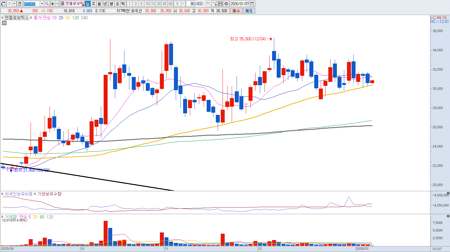 엔젤로보틱스는 상장 초기 기록했던 최고가 대비 주가가 크게 하락한 후 최근 3년 최저점 대비 60% 이상 반등하며 회복세를 보이고 있으나 여전히 실적이 뒷받침되지 않는 고평가 논란과 수급상의 불확실성이 큰 걸림돌입니다.