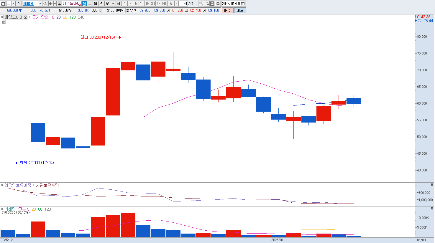 에임드바이오는 2025년 12월 코스닥 상장 이후 항체-약물 접합체(ADC) 분야의 기대감을 선반영하며 공모가 대비 높은 주가 수준을 형성했으나 최근 보호예수 물량 해제와 관련된 오버행 리스크가 부각되고 있습니다.