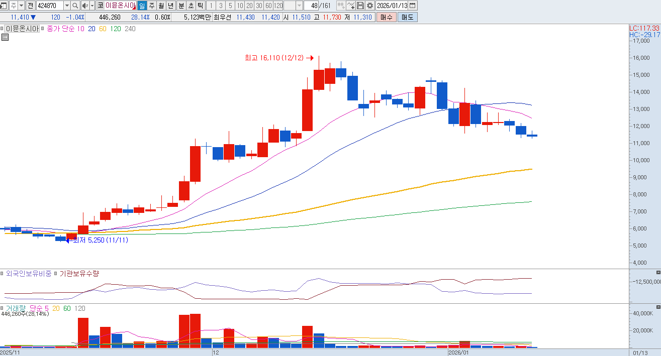 또 다른 핵심 자산인 CD47 항체 'IMC-002'는 글로벌 빅파마들이 부작용 문제로 난항을 겪는 분야에서 독보적인 안전성을 입증하며 차별화된 입지를 굳혔습니다. 단순히 기술 이전에 머무르지 않고 희귀암 시장을 출발점으로 한 조기 상용화 전략을 통해 실질적인 매출을 창출하는 '치료제 기업'으로의 진화를 도모하고 있습니다. 11,000원 지지여부가 중요하겠습니다. |