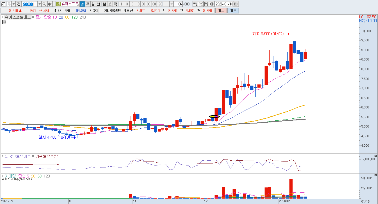 현대차그룹이 엔비디아와 협력하여 SDV 및 로보틱스 기술을 고도화함에 따라, 복잡해지는 소프트웨어 코드의 오류를 잡아내고 안정성을 확보하는 슈어소프트테크의 검증 솔루션은 대체 불가능한 인프라로 평가받고 있습니다. 8,000원은 중요 지지라인입니다. |