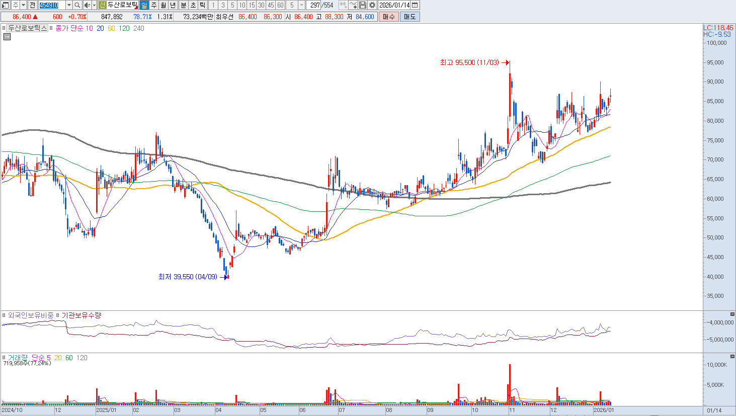 리스크 요인: 하드웨어 제조 측면에서는 중국 기업들의 저가 공세가 거세지며 마진율 하락 압박이 커지고 있습니다. 로봇 산업의 진정한 승부처가 하드웨어가 아닌 '두뇌' 역할을 하는 AI 소프트웨어로 이동하고 있어, 테슬라나 아마존 같은 빅테크들의 로봇 시장 진출은 강력한 위협이 됩니다. 또한 고금리 상황이 지속될 경우 로봇 도입을 고려하는 중소기업들의 설비 투자 심리가 위축될 수 있다는 점도 경계해야 할 부분입니다. 중요 지지선은 8만원입니다. |