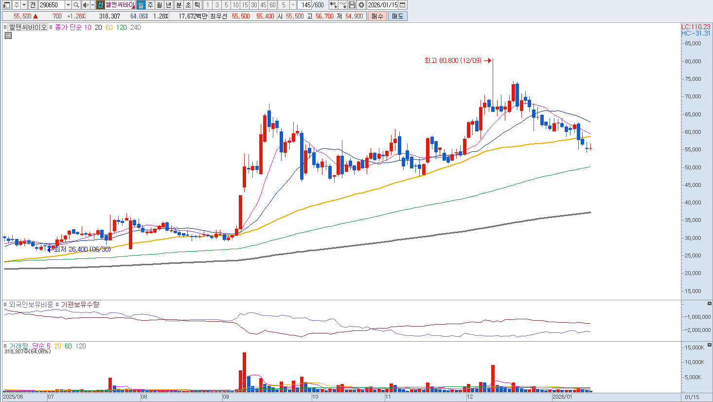 3. 글로벌 시장 진출: 중국 NMPA 승인과 1조 원 생산 능력 확보 엘앤씨바이오의 미래 가치를 결정지을 핵심 승부처는 중국 시장입니다. 동사는 중국 장쑤성에 약 1조 원 규모의 생산 능력을 갖춘 거대 생산 기지를 준공했으며, 최근 메가덤 플러스 등 주력 제품에 대한 중국 NMPA(국가약품감독관리국) 허가 절차를 순조롭게 진행하고 있습니다. 중국의 피부 이식재 시장 규모는 국내의 약 25배 이상인 30조 원 수준으로 추산되며, 2026년부터는 현지 생산 및 판매가 본격화됨에 따라 해외 매출 비중이 구조적으로 확대될 전망입니다. 또한 싱가포르와 일본 등 동남아시아 시장으로의 수출 라인업을 강화하며 글로벌 조직 재생 전문 기업으로서의 위상을 높이고 있습니다. 중요 지지라인은 51,500원입니다. |