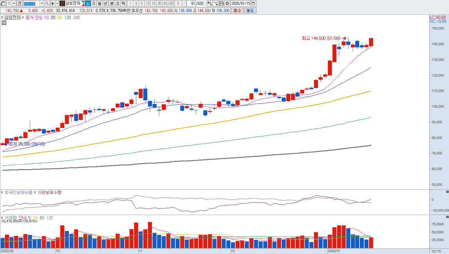 삼성전자는 2026년 연간 영업이익이 145조 원에 육박할 것이라는 낙관적인 컨센서스에도 불구하고 주가는 역설적으로 하락 압력을 받고 있습니다. 이는 시장의 기대치가 이미 '완벽한 실적' 그 이상을 요구하고 있기 때문이며 14만 원대를 돌파한 이후 가파르게 형성된 밸류에이션 상단은 추가 매수세를 유인하기에 버거운 수준입니다.