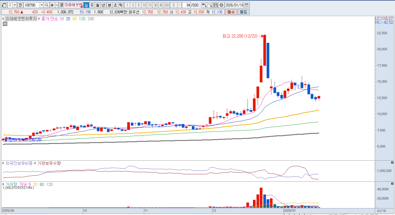 하지만 벤처캐피털 사업의 특성상 고금리 환경이나 경기 침체와 같은 매크로 환경의 변화는 피할 수 없는 제약 요인입니다. 자금 조달 비용의 상승이나 투자 기업들의 상장 지연은 수익 실현 시점을 늦추는 리스크로 작용할 수 있습니다. 그럼에도 불구하고 미래에셋벤처투자는 사모펀드 형태의 대형 투자 진행과 세컨더리 펀드 운용 등을 통해 투자 회수 경로를 다각화하며 이러한 리스크를 관리하고 있습니다. 결과적으로 미래에셋벤처투자는 혁신 기술에 대한 깊은 이해도와 글로벌 네트워크를 결합하여 대한민국을 대표하는 글로벌 투자 플랫폼으로 진화하고 있는 단계에 있다고 분석할 수 있습니다. 중요 지지선은 12,000원입니다. |