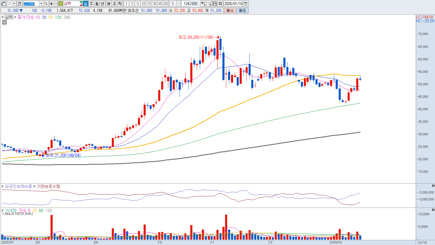 ② '슬림 FC-BGA' 기술을 통한 비메모리 영역 확장 기존 메모리 위주의 포트폴리오에서 벗어나 시스템 반도체용 FC-BGA(플립칩-볼그리드어레이) 시장으로의 확장이 돋보입니다. 특히 기판의 내부 지지층 두께를 절반으로 줄인 '슬림 FC-BGA' 양산에 성공하며, 모바일 기기와 웨어러블, SSD 컨트롤러 시장 등 공간 효율성이 중요한 첨단 IT 기기 시장에서 독보적인 경쟁력을 확보했습니다. 중요 지지라인은 45,000원입니다. |
