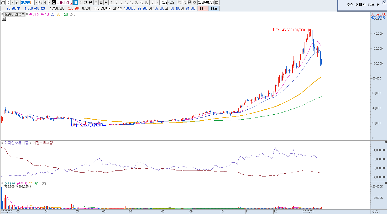 현재 오름테라퓨틱은 약 3,000억 원 규모의 현금 실탄을 장착하고 제2의 전성기를 준비하고 있습니다. 2026년 1월 JP모건 헬스케어 컨퍼런스에 참여하며 글로벌 BD(사업개발) 활동을 재개한 것이 그 신호탄입니다. 반등시마다 비중 축소 의견입니다. |