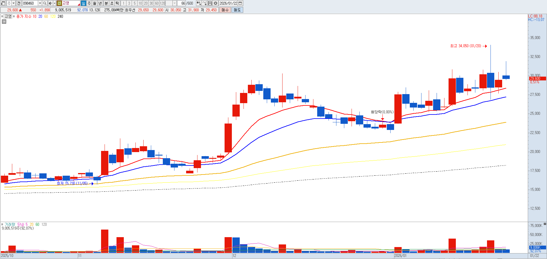 자동차 전장화 추세에 따라 전력 반도체 및 차량용 센서 검사 장비의 수요가 급증하고 있는 상황에서 고영의 고정밀 측정 기술은 불량률 제로를 지향하는 완성차 업체들에게 필수적인 선택지가 되고 있습니다. 기술 연구 중심의 기업 문화와 글로벌 네트워크 강화는 고영이 정밀 기계 공학의 한계를 지속적으로 돌파하게 만드는 원동력이 되고 있습니다. 1차 지지라인은 27,500원입니다. |