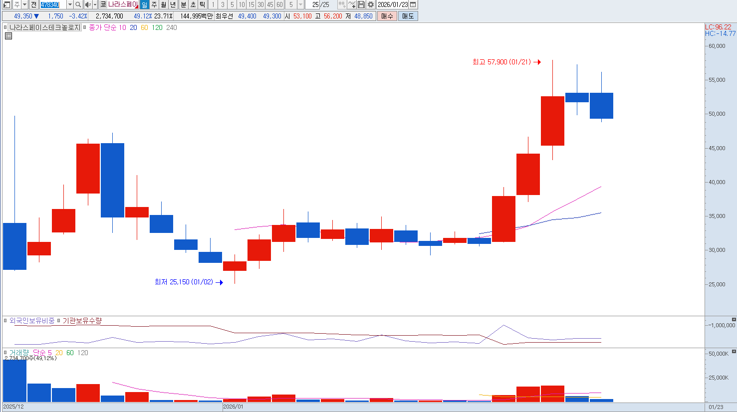 실시간 지구 관측 데이터를 기반으로 한 금융, 스마트시티, 환경 감시 비즈니스 모델을 구체화하고 있다고 전하고 있습니다. 또한 서울대, 천문연과 협력하여 국내 최초의 메탄 모니터링 위성 '나르샤' 개발을 추진하는 등 탄소 배출 규제 대응을 위한 글로벌 환경 데이터 시장 선점에 박차를 가하고 있습니다. 중요 지지라인은 47,000원입니다. |