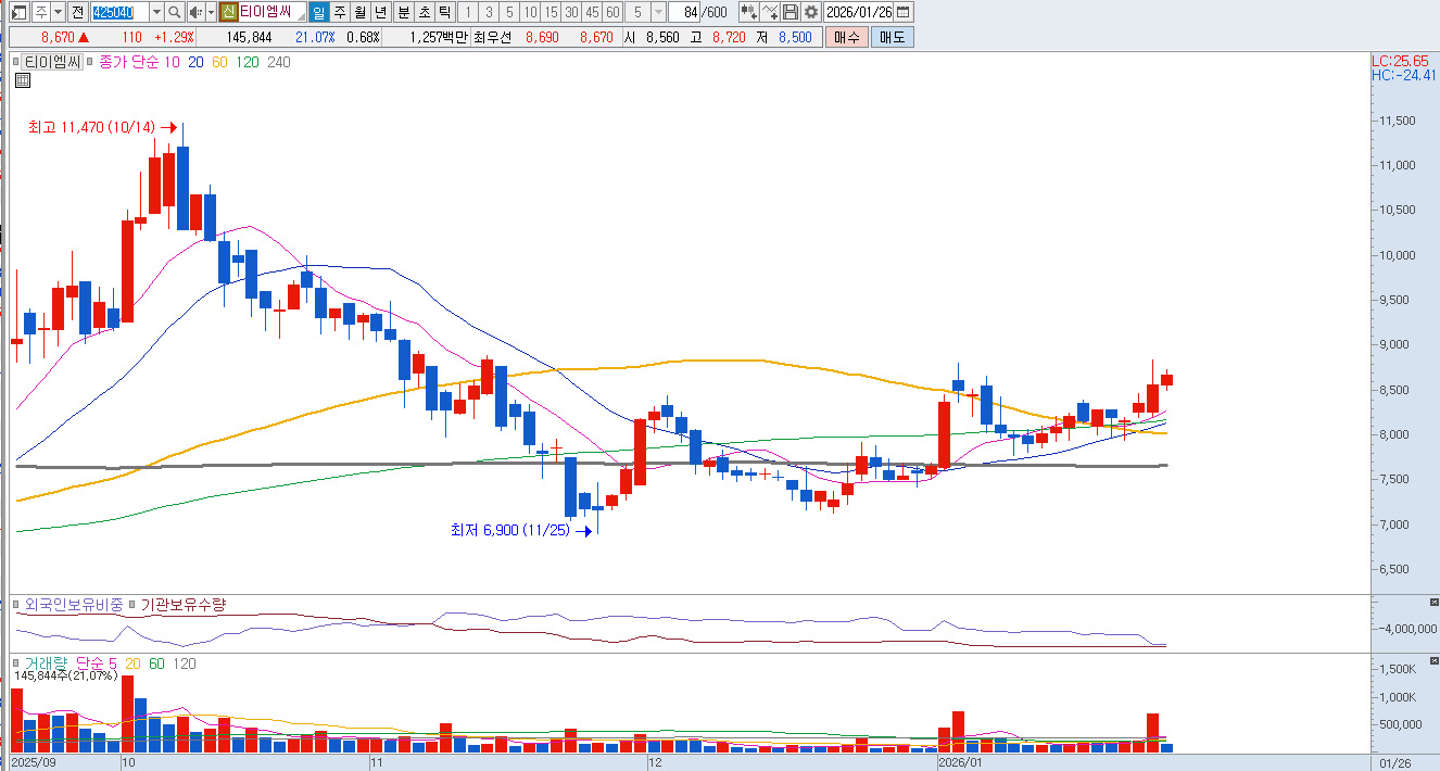 더욱 주목해야 할 점은 티이엠씨가 업계 최초로 성공시킨 희귀가스 리사이클링 사업으로, 이는 원자재 가격 변동 리스크를 최소화하고 수익 극대화를 가능하게 하는 차별화된 경쟁력입니다. 네온(Ne)과 같은 고가의 희귀가스를 포집하고 재가공하여 다시 공급하는 기술은 비용 절감뿐만 아니라 글로벌 고객사들이 요구하는 ESG 경영 기준을 충족시키는 강력한 무기가 되고 있습니다. 결론적으로 티이엠씨는 반도체 소재 국산화라는 정책적 수혜와 더불어 리사이클링을 통한 압도적인 원가 경쟁력을 모두 확보하고 있어, 향후 반도체 소재 섹터 내에서 가장 가파른 이익 성장을 보여줄 것으로 기대됩니다. 중요 지지라인은 8,250원입니다. |