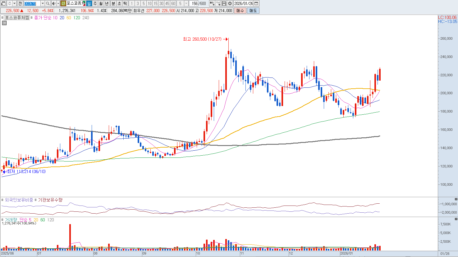 또한 포스코 그룹의 탄탄한 원료 공급망을 활용한 원가 경쟁력은 포스코퓨처엠만이 가질 수 있는 독보적인 강점입니다. 리튬, 니켈 등 핵심 광물의 안정적 수급은 대외 변동성이 큰 배터리 시장에서 가장 강력한 방어 기제가 되며, 이는 곧 장기 공급 계약에서 유리한 고지를 점하는 원동력이 됩니다. 차세대 먹거리인 인조흑연 및 실리콘 음극재 사업 역시 기술 고도화를 통해 가시적인 성과를 내고 있어, 양극재에 편중되지 않은 균형 잡힌 포트폴리오를 바탕으로 글로벌 배터리 소재 시장의 표준을 제시하는 선도 기업으로서의 위치를 더욱 공고히 할 전망입니다. 반등시마다 비중 축소 의견입니다. |