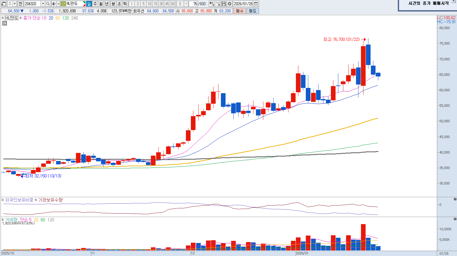 2026년은 HL만도가 자동차 부품사를 넘어 로봇 부품 시장으로 본격 진출하는 원년이 될 전망입니다. 자동차 샤시 기술에서 축적한 정밀 제어 역량은 휴머노이드 로봇 및 자율주행 로봇의 핵심인 액추에이터(Actuator) 개발로 자연스럽게 이어지고 있습니다. 최근 주요 증권사들이 HL만도를 '로보틱스 필수 부품업체'로 재평가하며 목표주가를 상향하는 이유도 바로 여기에 있습니다. 단순한 기대감을 넘어 올해부터 로봇 액추에이터 수주가 가시화될 것으로 예상되며, 이는 자동차 산업의 낮은 멀티플(주가수익비율)을 극복하고 로봇 섹터의 높은 가치를 부여받는 결정적 계기가 될 것입니다. 중요 지지라인은 6만원입니다. |