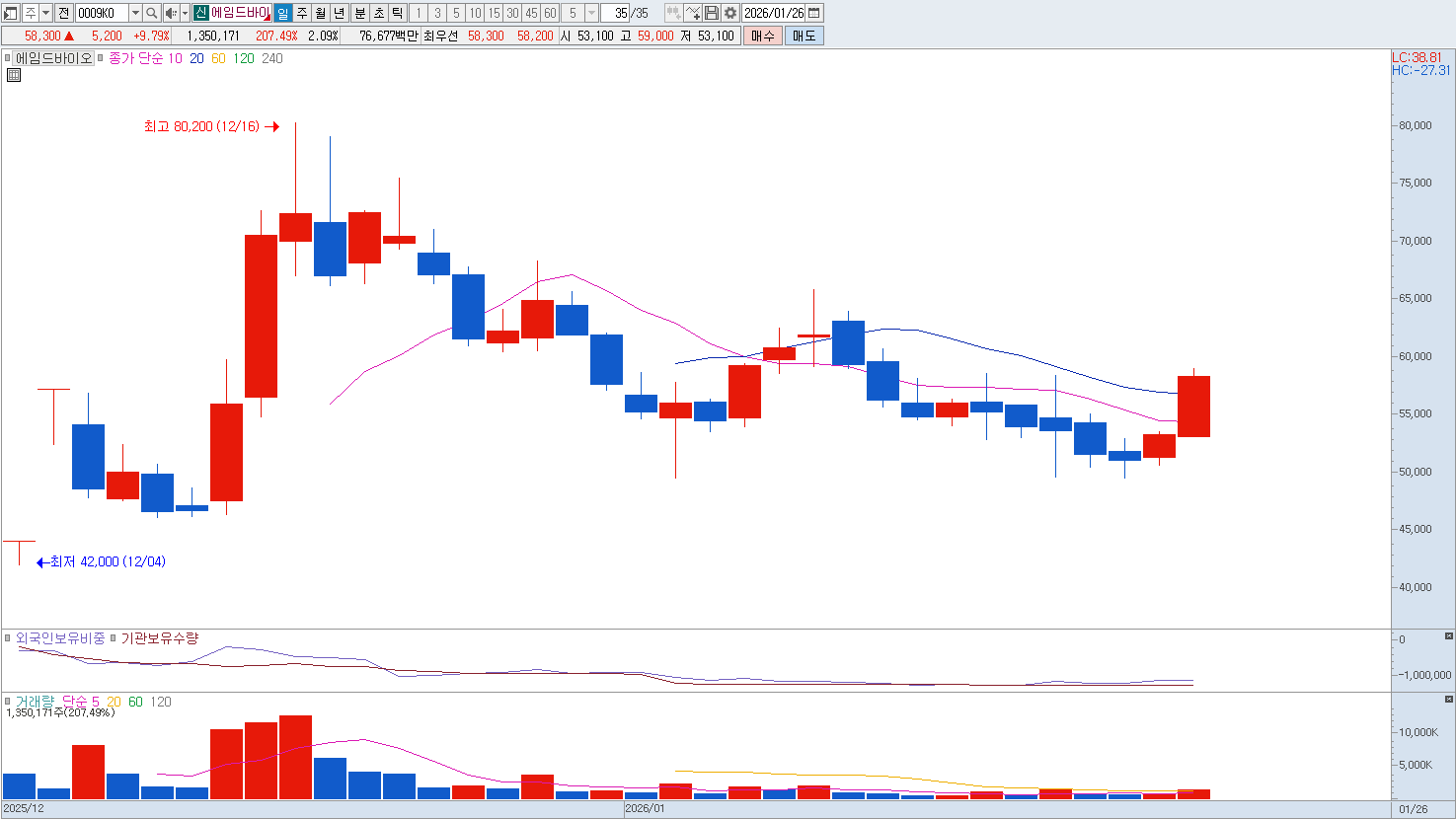 에임드바이오는 삼성서울병원의 방대한 임상 데이터와 환자 유래 모델을 결합한 P-ADC 플랫폼을 통해 항체-약물 접합체 분야에서 독보적인 기술적 완결성을 지향하고 있습니다. 일반적인 세포주 기반 연구의 한계를 넘어 실제 환자의 조직을 활용한 오가노이드 및 이종이식 모델에서 효능을 검증하기 때문에 임상 단계에서의 예측 가능성이 매우 높다는 점이 핵심적인 기술적 자산입니다. 특히 주력 파이프라인인 AMB302는 기존 경쟁사들이 공략하지 못한 새로운 FGFR3 도메인을 표적하여 암세포 내부로의 흡수 속도를 획기적으로 개선했으며 전임상 단계에서 완전 관해에 가까운 효능을 입증하며 기술적 가치를 증명했습니다. 하지만 이러한 고도의 기술력에도 불구하고 바이오텍 특유의 파트너십 리스크는 상존하며 이는 상장 초기 투자자들이 반드시 고려해야 할 변수입니다. 글로벌 제약사와의 기술 이전 계약은 해당 기업의 내부 전략 수정이나 임상 환경 변화에 따라 언제든 일정 지연이나 권리 반환의 가능성을 내포하고 있으며 이는 기업의 본질적인 기술력과는 별개의 비즈니스적 불확실성을 의미합니다. 또한 상장 직후 형성된 높은 기대감이 실제 임상 데이터가 도출되는 시점까지의 긴 공백기를 견뎌낼 수 있을지에 대한 수급 측면의 고민이 필요하며 기술의 혁신성과 사업의 불확실성 사이에서 균형 있는 시각을 유지하는 것이 중요합니다. 중요 지지라인 52,500원입니다.