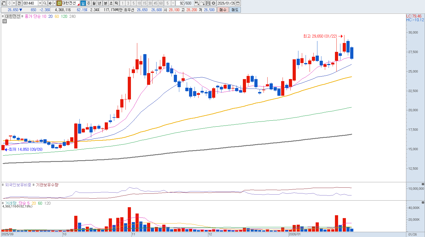 다만 전력 인프라 사업은 프로젝트 규모가 거대한 만큼 수주 후 실제 매출로 인식되기까지의 기간이 길고 공사 현장의 환경적 변수에 따른 비용 증가 리스크가 상존합니다. 또한 최근의 주가 상승세는 전력 산업의 호황을 상당 부분 선반영한 측면이 있어 향후 수주 모멘텀이 둔화되거나 원자재인 구리 가격의 급격한 변동이 발생할 경우 수익성 방어에 대한 의문이 제기될 수 있습니다. 기술적으로는 세계 최고 수준이나 산업 전체의 투자 정점 시점에 대한 논란이 있는 만큼 현재의 높은 위상이 지속 가능한 이익으로 연결되는 과정을 확인하며 냉철하게 접근할 필요가 있습니다. 중요 지지라인은 26,000원 부근입니다. |