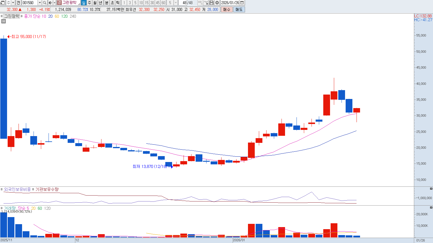 그러나 우주 및 방산 사업은 국책 과제 성격이 강해 실제 매출 발생 주기가 매우 길고 예산 편성 상황에 따라 사업 일정이 유동적이라는 구조적 한계가 있습니다. 여전히 매출의 상당 비중을 차지하는 디스플레이 및 반도체 광학 부품 시장은 글로벌 IT 수요 변화에 매우 민감하게 반응하여 실적의 변동성을 키우는 요인이 됩니다. 따라서 우주항공 기술의 상징적 가치가 실제 기업의 기초 체력을 안정적으로 지지해주기까지는 사업 포트폴리오의 완벽한 전환이 선행되어야 하며 기술의 화려함 뒤에 숨은 산업 구조적 취약성을 동시에 인지해야 합니다. 중요 지지라인은 27,500원입니다. |