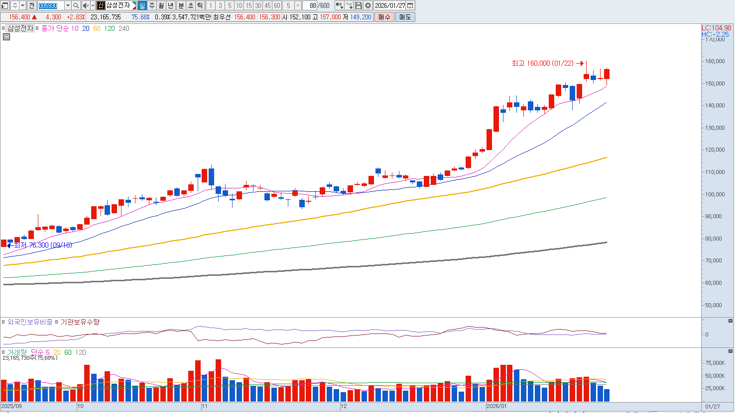 가전과 스마트폰 등 세트 부문에서도 폴더블 폰 이후의 혁신적인 폼팩터 제시가 늦어지면서 브랜드의 신비감이 약화되고 있으며, 지정학적 이슈로 인해 미국과 중국 사이에서 생산 기지와 공급망을 재편해야 하는 복잡한 함수 관계는 삼성전자의 경영 효율성을 저해하는 거대한 불확실성 덩어리가 되었습니다. 숨고르기가 나올 수 있는 구간입니다. 이익확정이 필요합니다. |