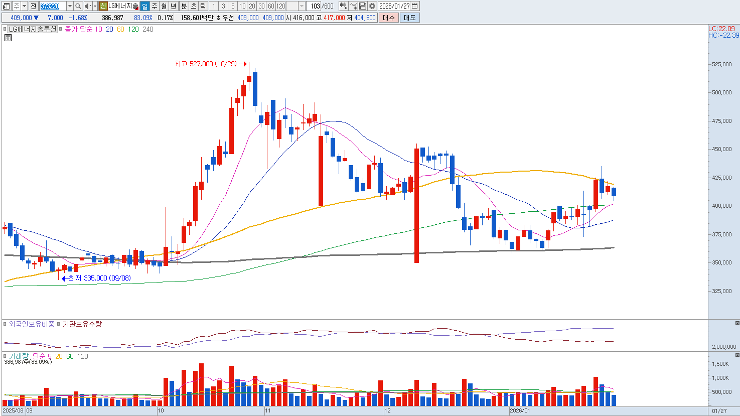 다만 미국 대선 이후 IRA 보조금 정책의 변화 가능성과 리튬 등 주요 메탈가 변동에 따른 판가 하락 리스크는 수익성 방어의 최대 변수로 작용할 수 있어 보조금 의존도를 낮추는 본원적 경쟁력 확보가 시급한 시점입니다. 1차 지지라인은 400,000원입니다. |