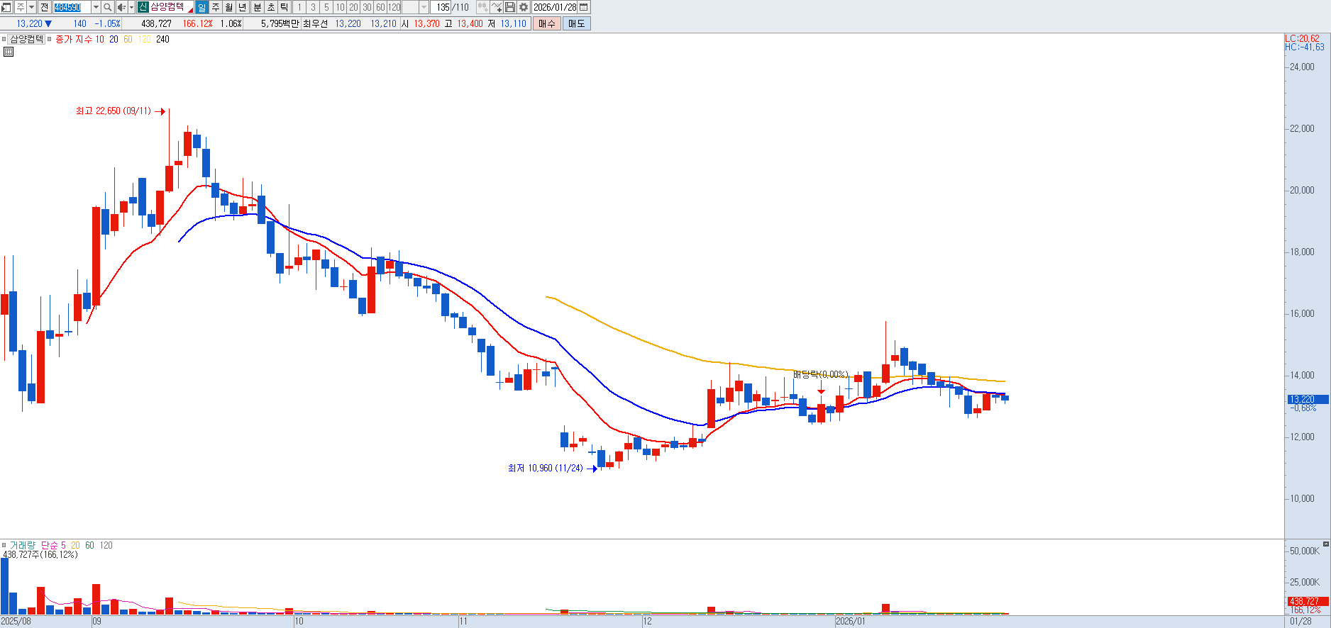 삼양컴텍은 2025년 8월 상장 당시 공모가 대비 100% 이상 상승하며 시장의 뜨거운 관심을 받았으나, 이후 주가는 고점 대비 40% 이상 하락하는 등 전형적인 '상장 초기 과열 후 조정' 국면을 지나고 있습니다. 가장 큰 문제는 상장 당시 유입되었던 외국인과 기관 투자자들의 차익 실현 매물이 2026년 초까지도 완전히 소화되지 않았다는 점입니다. 특히 보호예수가 해제되는 시점마다 오버행(잠재적 매도 물량) 리스크가 부각되며 반등의 발목을 잡고 있으며, 장기 이평선 아래에서 주가가 형성되면서 기술적으로 역배열 구간에 진입해 있다는 점이 심리적 매수세를 위축시키는 요인으로 작용하고 있습니다.러시아-우크라이나 전쟁 이후 폭발적이었던 글로벌 방산 수요가 2026년에 접어들며 점차 안정화 단계에 진입하고 있다는 시장의 우려가 깊어지고 있습니다. 폴란드나 중동향 대규모 수주 소식은 이미 주가에 선반영된 측면이 크며, 이제는 '추가 수주'보다는 '실제 인도 및 매출 인식' 단계에 들어섰습니다. 하지만 방산 제품 특상상 계약 체결 후 실제 부품 공급과 매출 인식이 일어나기까지 상당한 시차가 존재하기 때문에, 투자자들이 기대하는 '실적 퀀텀 점프'가 나타나기 전까지 수급 공백기가 길어질 수 있습니다. 이러한 '기다림의 지루함'은 단기 투자자들의 이탈을 가속화하는 매도 유인이 됩니다.방탄 제품의 핵심 원료인 특수 강판 및 복합 소재의 글로벌 가격 변동성은 삼양컴텍의 수익성을 위협하는 구조적 리스크입니다. 최근 공급망 불안정으로 인해 원자재 가격이 상승했으나, 정부나 대형 체계 종합 업체(현대로템 등)와의 납품 단가 조정에는 일정한 시간이 소요되거나 반영 비율이 낮을 수 있습니다. 이는 매출은 늘어나더라도 영업이익률이 정체되거나 하락하는 '외화내빈'의 결과를 초래할 수 있으며, 고성장주로서 누리던 프리미엄 밸류에이션을 정당화하기 어렵게 만듭니다. 매도의견입니다.