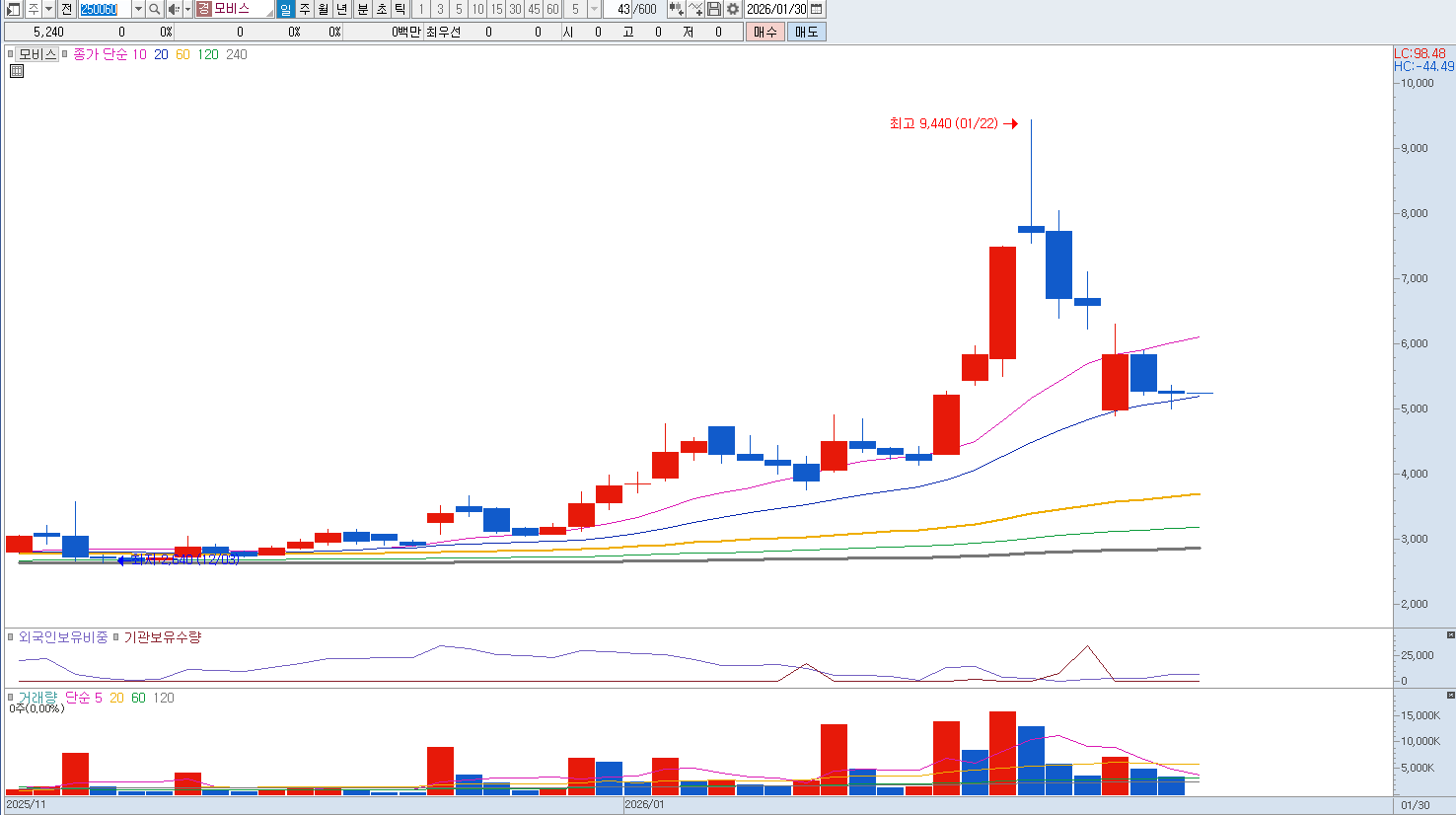 4. 주의해야 할 리스크 및 투자 시 고려사항 높은 기술력에도 불구하고 모비스는 전방 산업의 프로젝트 수주 시기에 따라 실적 변동성이 크게 나타나는 특성이 있습니다. 2025년 3분기 기준 매출은 증가세를 보였으나, 신규 사업 투자와 연구개발비 지출로 인해 영업 이익 측면에서는 다소 부침을 겪고 있는 국면입니다. 또한 시가총액이 크지 않은 중소형주 특성상 테마성 뉴스에 따른 주가 변동폭이 매우 크기 때문에, 단기적인 주가 등락에 일희일비하기보다는 기업이 추진 중인 양자컴퓨팅이나 핵융합 상용화 로드맵의 실질적인 진척도를 확인하며 긴 호흡으로 접근하는 것이 필요합니다. 중요 지지라인은 4,500원입니다. |