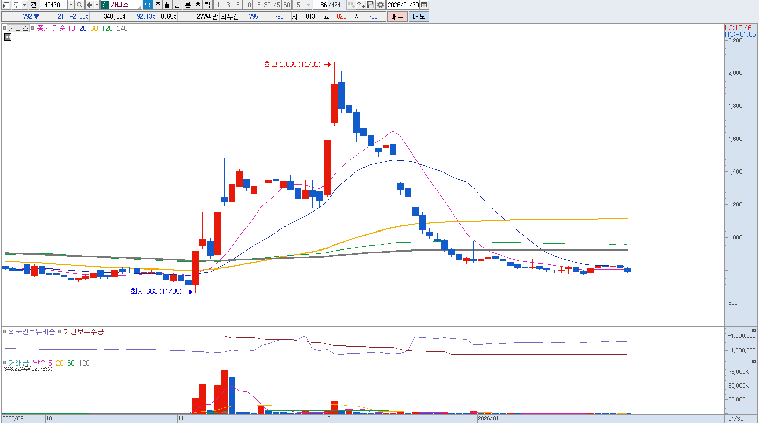 기회 요인 (Bull): 카티스는 2026년까지 자사 제품인 '엑시퀀트'를 고도화하고 국정원 인증 취득을 통해 양자보안 시장 선점을 노리고 있습니다. 원전, 공항 등 국가 중요 시설의 통합 보안 플랫폼 수요가 증가하는 추세는 장기적인 먹거리입니다. 주가가 3년 최저점 부근(700~800원대)에 도달하여 기술적으로는 '과매도' 구간에 진입했다는 분석도 존재합니다.