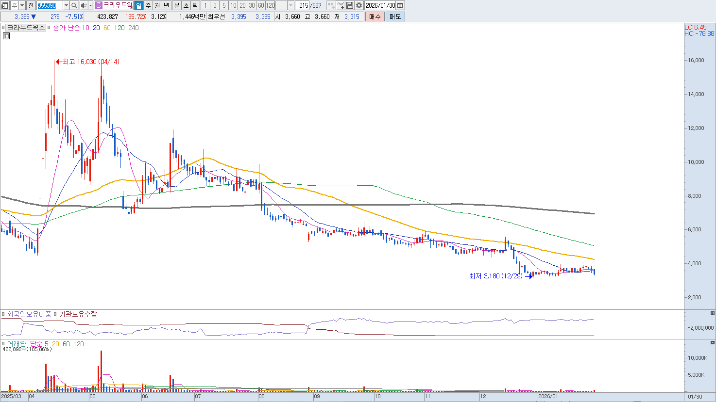 과거에는 수작업 중심의 라벨링 데이터가 높은 부가가치를 창출했으나, 이제는 생성형 AI 자체가 스스로 학습 데이터를 생성하는 단계에 이르면서 크라우드웍스의 중개 플랫폼 가치가 하락하고 있습니다. 두 번째는 상장 후 지속적으로 쏟아지는 대규모 보호예수 해제 물량(오버행) 리스크입니다.