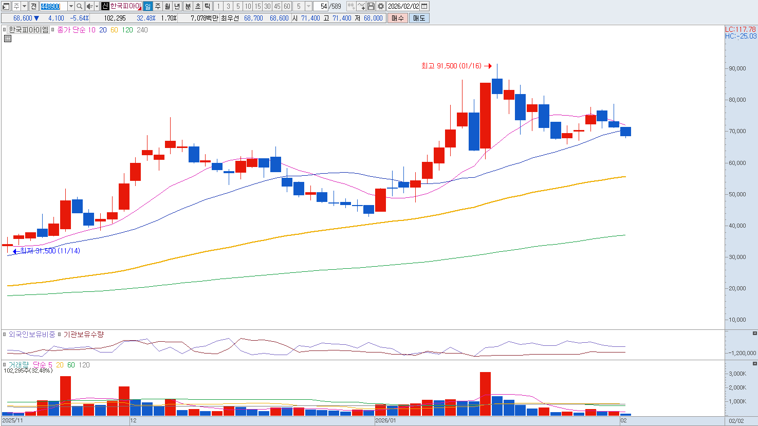 또한 고가의 금속 분말 원재료 가격 변동에 민감한 수익 구조를 가지고 있어 원가 관리 능력이 기업의 생존을 결정짓는 핵심 변수가 되고 있습니다. 한국피아이엠은 기술적 완성도는 매우 높으나 외부 매크로 환경 변화에 민감하게 반응하는 사업 구조를 얼마나 빠르게 다변화하느냐가 향후 성장성을 결정짓는 균형점이 될 것입니다. 소재 대표 기업이기에 목표가 105,000원, 손절가 65,000원 제시합니다. |