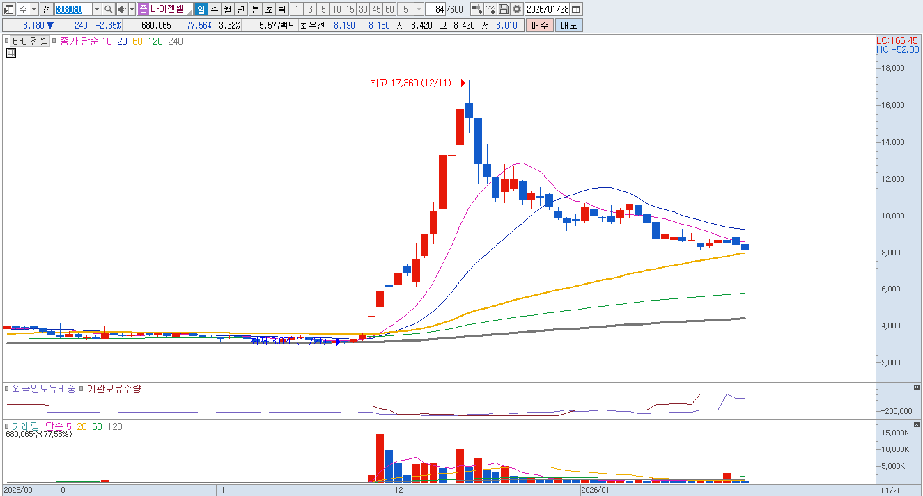 바이젠셀은 바이티어 외에도 골수유래 억제세포를 활용한 면역억제 플랫폼인 바이메디어(ViMedier)와 감마델타 T세포 기반의 범용 면역세포치료 플랫폼인 바이레인저(ViRanger)를 통해 파이프라인을 다변화하고 있습니다. 특히 바이레인저는 환자 본인의 세포가 아닌 타인의 세포를 활용할 수 있는 동종 세포치료제 기술로, 치료제의 대량 생산과 비용 절감을 가능케 하는 게임 체인저가 될 것으로 기대됩니다. 자체 GMP 생산 시설을 구축하여 연구 개발부터 제조까지 전 과정을 내재화했으며, 정밀의료진단 그룹을 신설하여 진단부터 치료, 모니터링까지 아우르는 통합 헬스케어 기업으로 거듭나고 있습니다. 면역항암제 시장의 성장에 따라 바이젠셀의 플랫폼 기술 수출 및 글로벌 파트너십 확대가 미래 성장의 핵심 동력이 될 것입니다. 8,000원은 매우 중요한 지지라인입니다. |