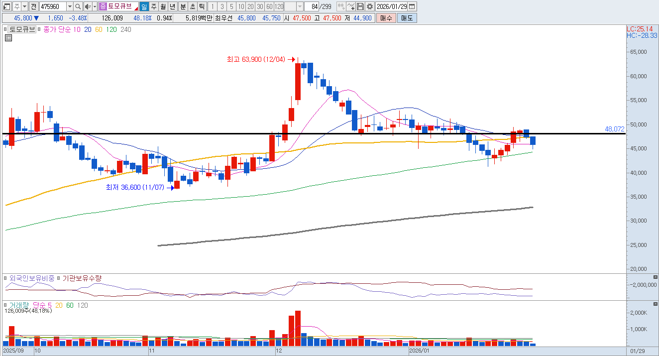 토모큐브는 2026년을 손익분기점(BEP) 달성의 원년으로 목표하고 있으나, 2025년 결산 기준 여전히 영업손실이 지속되고 있는 상황입니다. 기술특례 상장 기업으로서 초기 연구개발비와 마케팅 비용 지출이 불가피하더라도, 실제 매출 성장 속도가 시장의 눈높이를 맞추지 못할 경우 실망 매물이 출회될 가능성이 높습니다. 특히 흑자 전환이 예상보다 늦어질 경우 현금 흐름에 대한 우려가 다시 부각될 수 있습니다.
