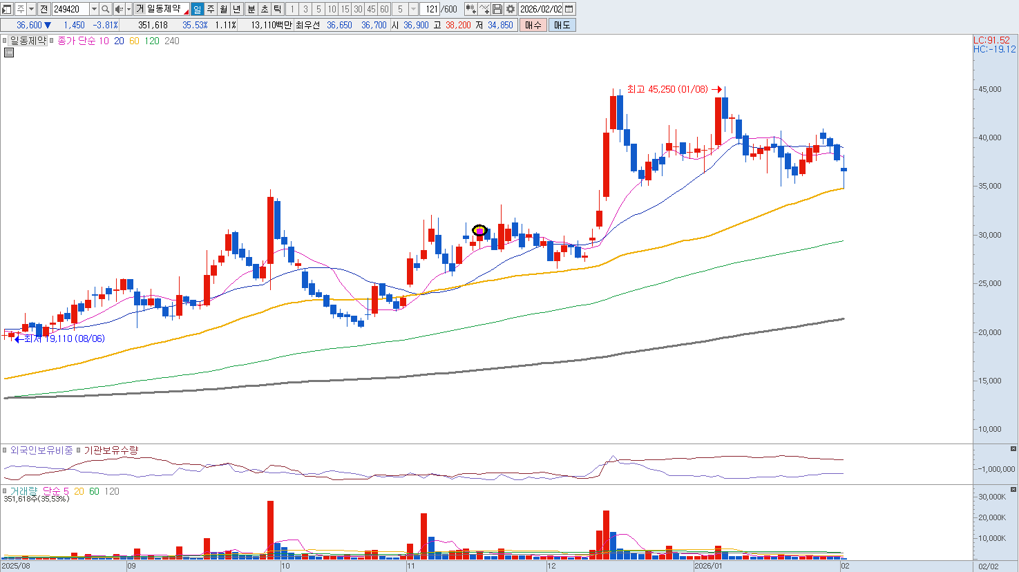 산업 규제 및 약가 인하: 국내 제약 산업 전반에 예고된 대규모 약가 인하 정책은 전통적인 내수 매출 비중이 높은 일동제약에게 본업의 이익 체력을 시험하는 요소가 될 수 있습니다. 35,000원은 중요 지지라인입니다. |