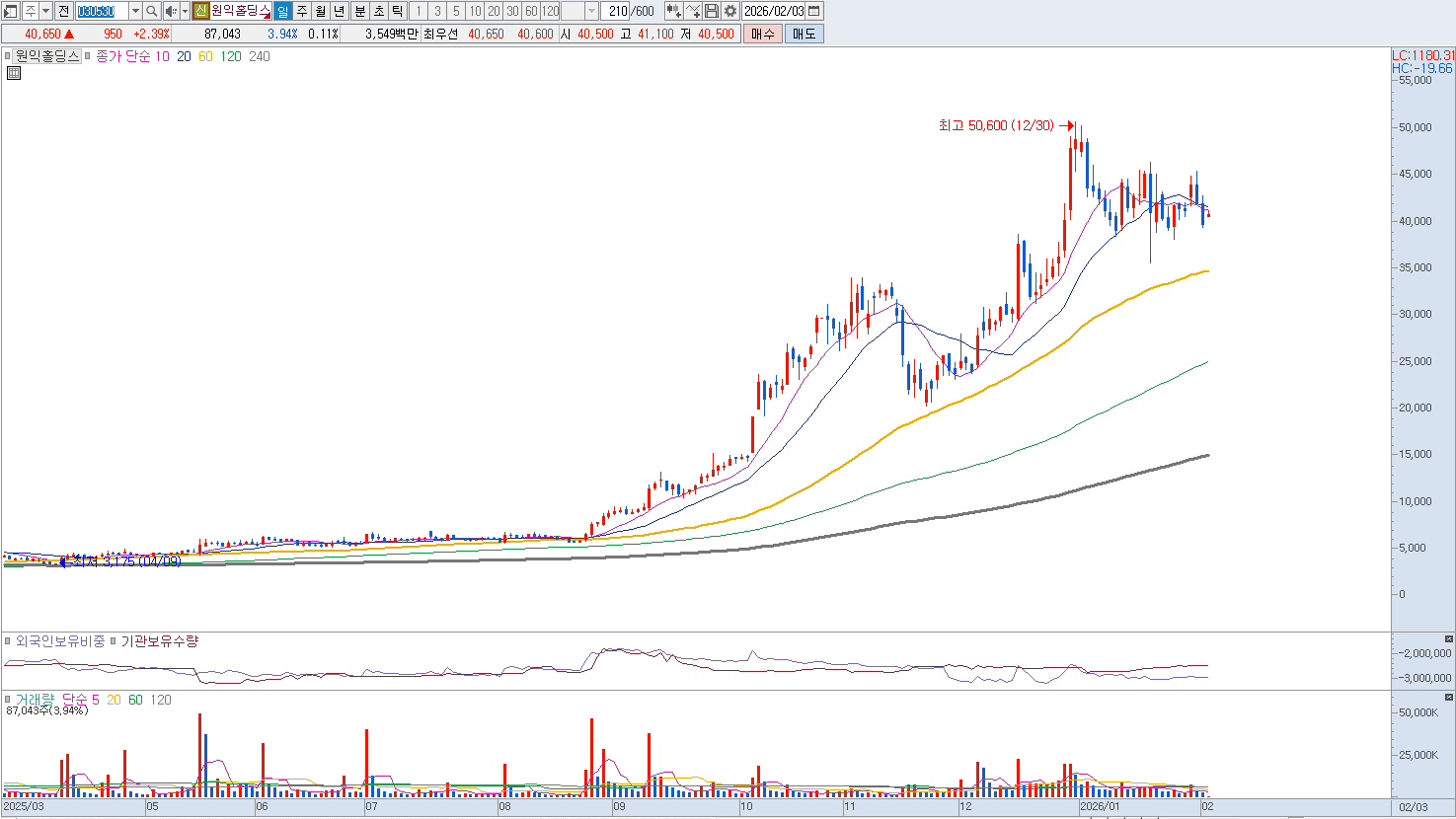 원익홀딩스는 반도체 및 디스플레이 장비 그룹의 컨트롤 타워 역할을 수행하고 있으나, 2026년 현재 기업 펀더멘털을 압도하는 과도한 투기적 수요와 지배구조 리스크가 매도 관점의 중심에 서 있습니다. 가장 큰 문제는 2024년 말부터 2026년 초까지 이어진 비이성적인 주가 폭등입니다. 특별한 실적 개선이나 기술적 혁신 없이 지수 편입이나 특정 테마의 영향으로 저점 대비 수천 퍼센트 급등한 주가는 펀더멘털과 완전히 괴리된 상태입니다.