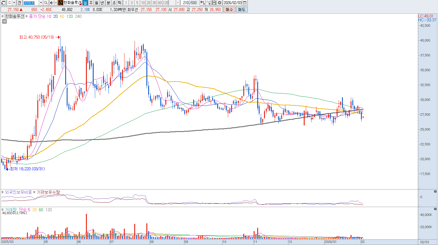 두 번째 리스크는 막대한 시설 투자(CAPEX)로 인한 재무적 부담입니다. 미국 내 태양광 통합 단지 '솔라허브' 구축을 위해 쏟아부은 수조 원 규모의 투자는 차입금 급증으로 이어졌으며, 고금리 환경 속에서 발생하는 막대한 이자 비용은 태양광에서 벌어들이는 이익을 상쇄하고 있습니다. 특히 미국 카터스빌 공장 가동 지연과 공급망 규제 강화는 한화솔루션이 기대했던 '장밋빛 미래'를 지연시키는 주범입니다. 신재생에너지라는 테마에 가려져 있던 과도한 부채와 업황 부진의 현실이 실질적인 기업 가치를 훼손하고 있는 시점이므로, 보수적인 자산 배분이 절실합니다. 매도의견입니다. |
