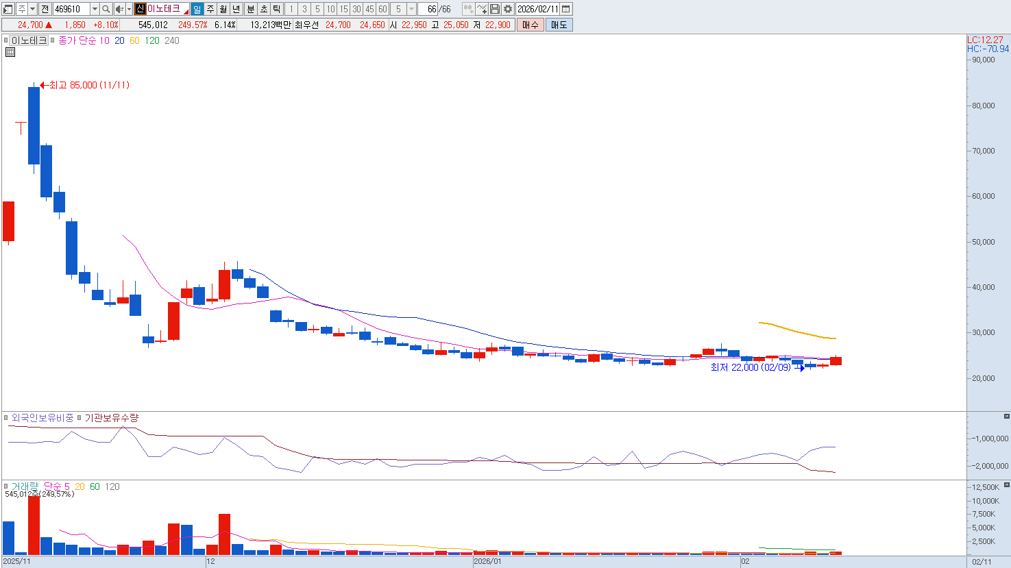 상장 초기 오버슈팅에 따른 가격 거품의 처참한 붕괴 이노테크는 상장 직후 공모가 대비 과도한 프리미엄이 붙으며 시가총액이 펀더멘털을 한참 앞질러 갔던 종목입니다. 2025년 11월 상장 당시 기록했던 최고가 85,000원은 기업의 실질 가치보다는 신규 상장주에 대한 투기적 수요가 만들어낸 '신기루'였음이 드러나고 있습니다. 2026년 2월 현재 주가는 22,000원 대까지 밀려나며 상장 시점의 기대치를 송두리째 반납했습니다. 이러한 급격한 우하향 곡선은 단순히 시장이 안 좋아서가 아니라, 초기 공모가 산정 및 상장 직후 형성된 가격대가 비정상적으로 높았음을 시사합니다. 한 번 꺾인 추세는 저가 매수세 유입보다는 '탈출 매물'을 더 강하게 유도하고 있어, 추가 하락에 대한 공포가 시장을 지배하고 있는 상황입니다.