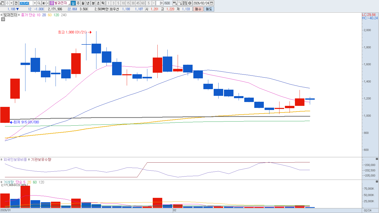 더욱 우려스러운 부분은 최근 주가가 펀더멘털의 개선 없이 특정 테마나 수급에 의해 급격히 변동하며 '투자 경고 종목' 등으로 지정되는 등 투기적 흐름이 강해졌다는 점입니다. 이는 주가가 실제 기업 가치를 상회하는 '오버슈팅' 구간에 진입했음을 시사하며, 수급 주체의 이탈 시 하방 지지선이 없는 가파른 급락으로 이어질 가능성이 매우 높습니다. 기술적으로도 장기 이평선과의 괴리가 벌어진 상태에서 매물이 출회될 경우, 이를 받아낼 실질적인 실적 모멘텀이 부재하여 장기 소외주로 전락할 위험이 큽니다. 따라서 현재의 변동성을 수익 실현의 기회로 삼아 보수적으로 매도 대응하는 전략이 요구됩니다. |