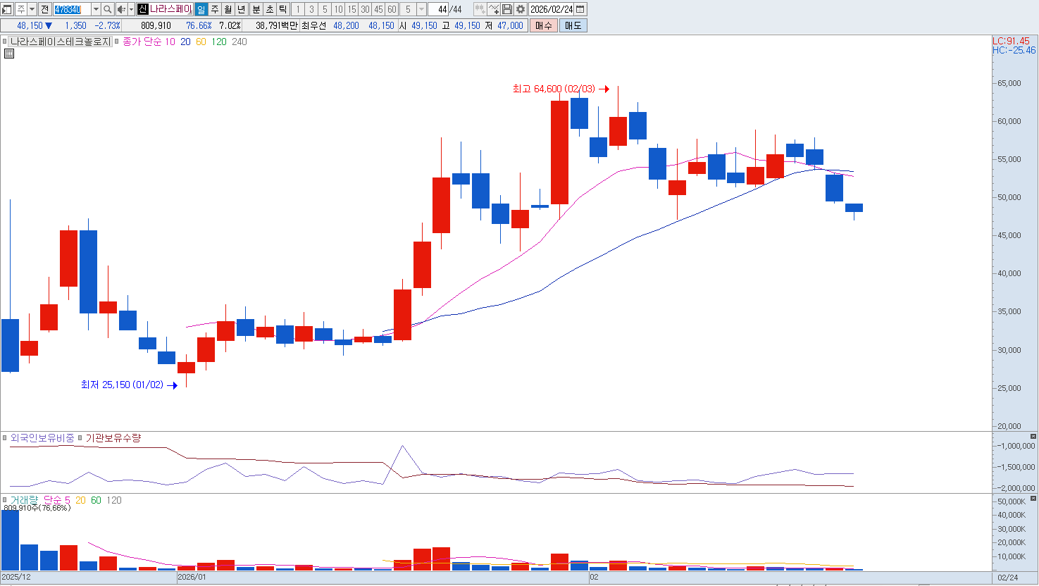 더욱 우려스러운 부분은 상장 이후 지속적으로 시장에 출회되고 있는 구주 매출과 보호예수 해제 물량입니다. 2026년 상반기까지 벤처금융 등 기존 투자자들의 지분 매각이 이어지면서 주가 상단이 강력하게 억눌리고 있으며, 공모가 대비 현저히 낮은 단가로 주식을 보유한 초기 투자자들의 차익 실현 욕구는 주가의 하방 압력을 가중시키는 핵심 요인입니다. 기술 특례 상장 기업으로서 실적 가시성이 확보되지 않은 상태에서 '우주 테마'만으로 유지되던 주가는 거품이 걷히는 국면에 진입했습니다. 현재 주가는 52주 최고점 대비 큰 폭으로 하락한 후 기술적 반등을 시도하고 있으나, 의미 있는 지지선 구축 실패 시 추가적인 낙폭 과대 구간으로 진입할 위험이 큽니다. 따라서 막연한 성장성에 기대기보다는 리스크 관리 차원에서 비중을 축소하고 보다 안정적인 섹터로 자금을 이동시키는 전략이 요구됩니다. |