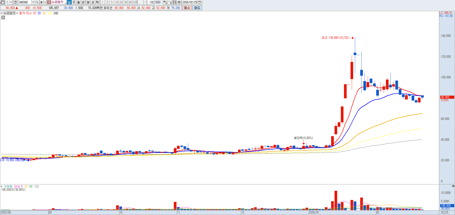 하지만 협동 로봇 시장의 급격한 성장은 동시에 글로벌 대형 로봇 기업들과의 피할 수 없는 정면 승부를 의미합니다. 자본력과 브랜드 인지도를 앞세운 대기업들의 공세 속에서 뉴로메카가 독자적인 생태계를 유지하기 위해서는 지속적인 R&D 투자와 신속한 상업화 능력이 요구됩니다. 또한 인력 중심의 커스터마이징 수주 방식이 가진 수익성 한계를 극복하고, 표준화된 플랫폼 판매 비중을 얼마나 빠르게 늘리느냐가 본격적인 규모의 경제를 달성하기 위한 핵심 과제입니다. 직전고점까지 보면서 분할매도 의견입니다.