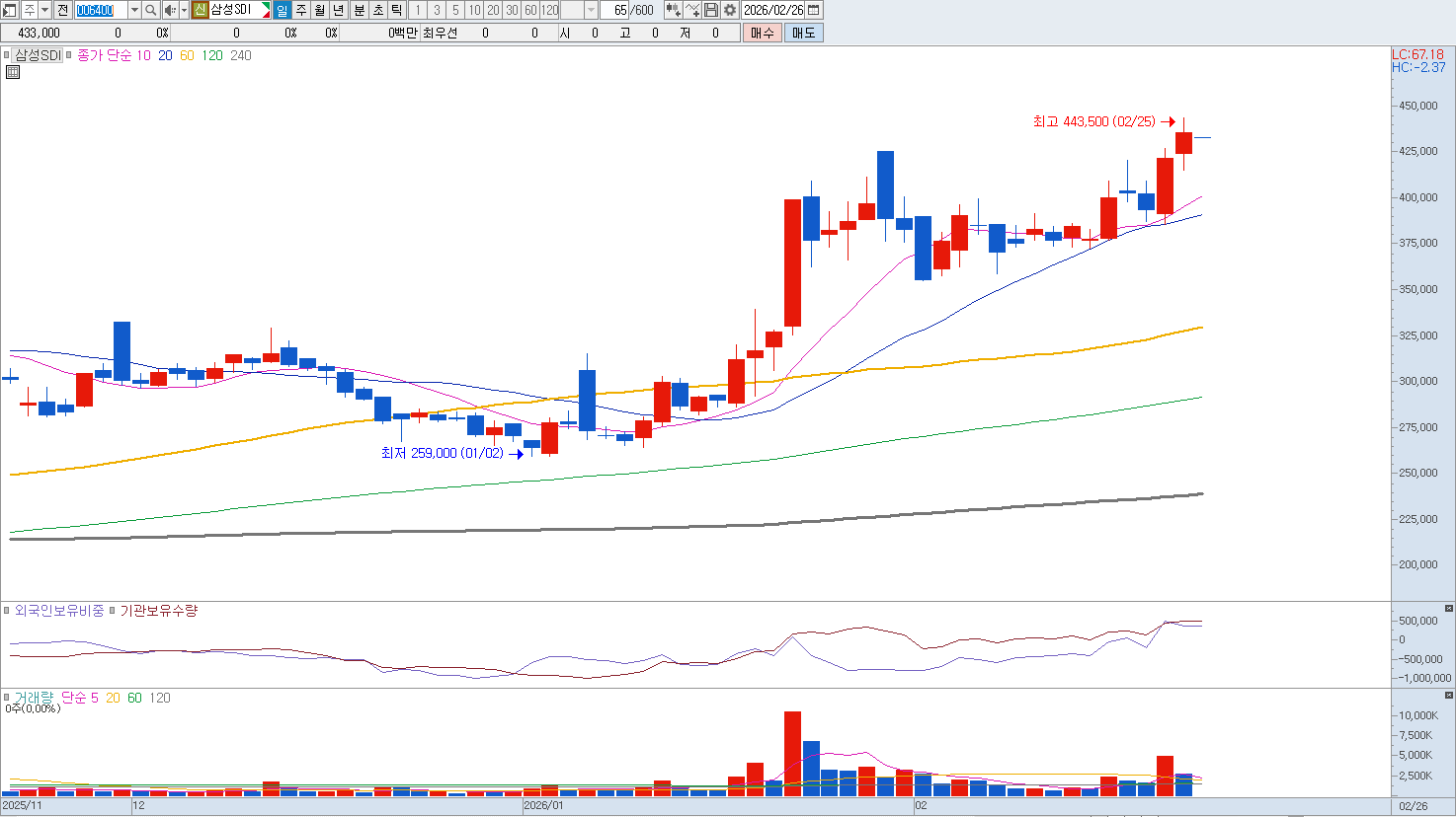 삼성SDI는 2026년 현재 전 세계 배터리 시장의 '캐즘(Chasm)' 구간을 기술적 해자와 프리미엄 전략으로 돌파하며 차세대 에너지 솔루션의 표준을 정립하고 있습니다. 동사는 양적인 팽창보다는 질적인 성장을 우선시하는 경영 기조를 유지하며, 업황 변동성에 대응할 수 있는 고부가가치 제품군과 강력한 차세대 기술 로드맵을 통해 기업의 내재 가치를 강화하는 데 집중하고 있습니다. 1. 46파이 원통형 배터리 양산과 폼팩터 다변화의 결실삼성SDI는 2026년 상반기를 기점으로 차세대 원통형 배터리인 '46파이(지름 46mm)' 제품의 본격적인 양산 체제에 돌입했습니다. 천안 및 베트남 법인을 중심으로 시작된 46파이 양산은 기존 2170 대비 에너지 밀도와 출력을 획기적으로 높였으며, 북미 주요 완성차 업체와 유럽의 BMW 등에 공급되며 동사의 기술력을 입증하고 있습니다. 특히 4680, 4695 등 고객사의 요구에 맞춘 다양한 높이의 라인업을 유연하게 생산할 수 있는 공정 최적화를 달성하며, 원통형 시장 내에서의 주도권을 빠르게 회복하고 있습니다. 2. 전고체 배터리(ASSB) 양산 준비와 '꿈의 배터리' 선점2026년은 삼성SDI가 공언한 2027년 전고체 배터리 상용화를 위한 '모든 퍼즐이 맞춰지는 해'입니다. 동사는 황화물계 고체 전해질 기술을 기반으로 이미 900Wh/L급의 높은 에너지 밀도를 가진 시제품 성능을 확보했으며, 수원 소재 파일럿 라인인 'S-라인'을 통해 실제 양산 공법과 인터페이스 안정화 기술을 최종 검증하고 있습니다. 리튬메탈 음극과 무음극(Anode-less) 기술을 적용한 삼성만의 독자적 플랫폼은 화재 안전성과 주행 거리를 동시에 해결할 수 있는 게임 체인저로 평가받으며, 로봇, UAM(도심항공교통), 웨어러블 기기 등 신규 응용처 확대를 위한 협의를 가속화하고 있습니다. 3. 북미 생산 거점 전략의 재편과 JV 운영의 효율화북미 시장 대응을 위한 합작법인(JV) 전략은 2026년 현재 철저한 효율화 과정을 거치고 있습니다. 스텔란티스와의 인디애나 합작 공장은 가동을 본격화하며 현지 생산 비중을 높이고 있으며, GM과의 합작 공장은 시장 수요 변화에 맞춰 가동 시점을 유연하게 조정하며 재무적 리스크를 관리하고 있습니다. 이러한 '선택과 집중' 전략은 과잉 투자를 방지하고, AMPC(첨단제조생산세액공제) 수혜를 극대화할 수 있는 최적의 시점을 조율하는 결과로 이어지고 있습니다. 북미 내 각형 및 원통형 배터리 공급 거점을 동시에 확보함으로써 폼팩터 다양성을 중시하는 북미 고객사들의 요구를 충족시키는 유일한 대안으로 부상하고 있습니다. 4. AI 데이터센터 향 ESS 및 전자재료 사업의 방어막 역할전기차 수요 둔화 국면에서 삼성SDI의 수익성을 지탱하는 핵심축은 ESS(에너지저장장치)와 전자재료 사업입니다. 2026년 현재 AI 데이터센터의 폭발적 증가와 함께 비상 전원 장치(BBU) 및 대용량 ESS 수요가 급증하고 있으며, 동사는 고안전성 각형 배터리와 LFP 배터리 라인업을 통해 북미 ESS 시장 점유율을 확대하고 있습니다. 또한 반도체 및 OLED 소재를 다루는 전자재료 사업은 서버급 반도체 수요 회복과 맞물려 견고한 이익률을 유지하며, 배터리 부문의 업황 노이즈를 상쇄하는 강력한 완충 지대 역할을 수행하고 있습니다. 홀딩의견입니다. |