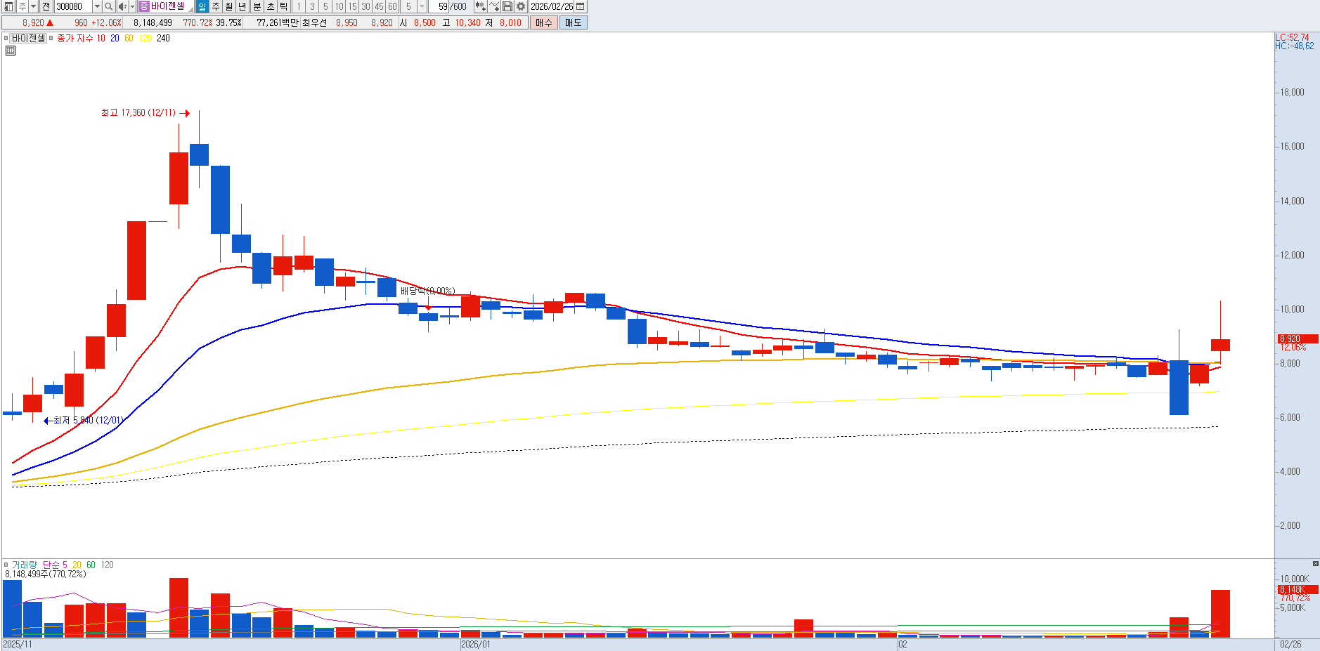 더욱 우려스러운 부분은 이러한 실패가 초래할 재무적 악순환입니다. 임상 중단으로 인해 예정되었던 기술 수출(L/O) 논의는 사실상 백지화되었으며, 이는 신약 개발 지속을 위한 추가 자금 조달에 심각한 차질을 빚게 합니다. 자본 잠식 우려를 해소하기 위해 또다시 대규모 유상증자나 전환사채 발행에 나설 경우 주주 가치는 걷잡을 수 없이 희석될 것입니다. 'VT-EBV-N' 등 남은 파이프라인에 집중하겠다는 회사의 발표는 시장에서 전형적인 리스크 회피용 수사로 받아들여지고 있습니다. 기술적 해자가 무너진 상황에서 막연한 임상 성공의 꿈에 베팅하기보다는, 신뢰가 무너진 현재 구간에서 과감하게 포지션을 정리하고 기회비용을 보전하는 것이 현명한 판단입니다. 매도관점입니다. |
