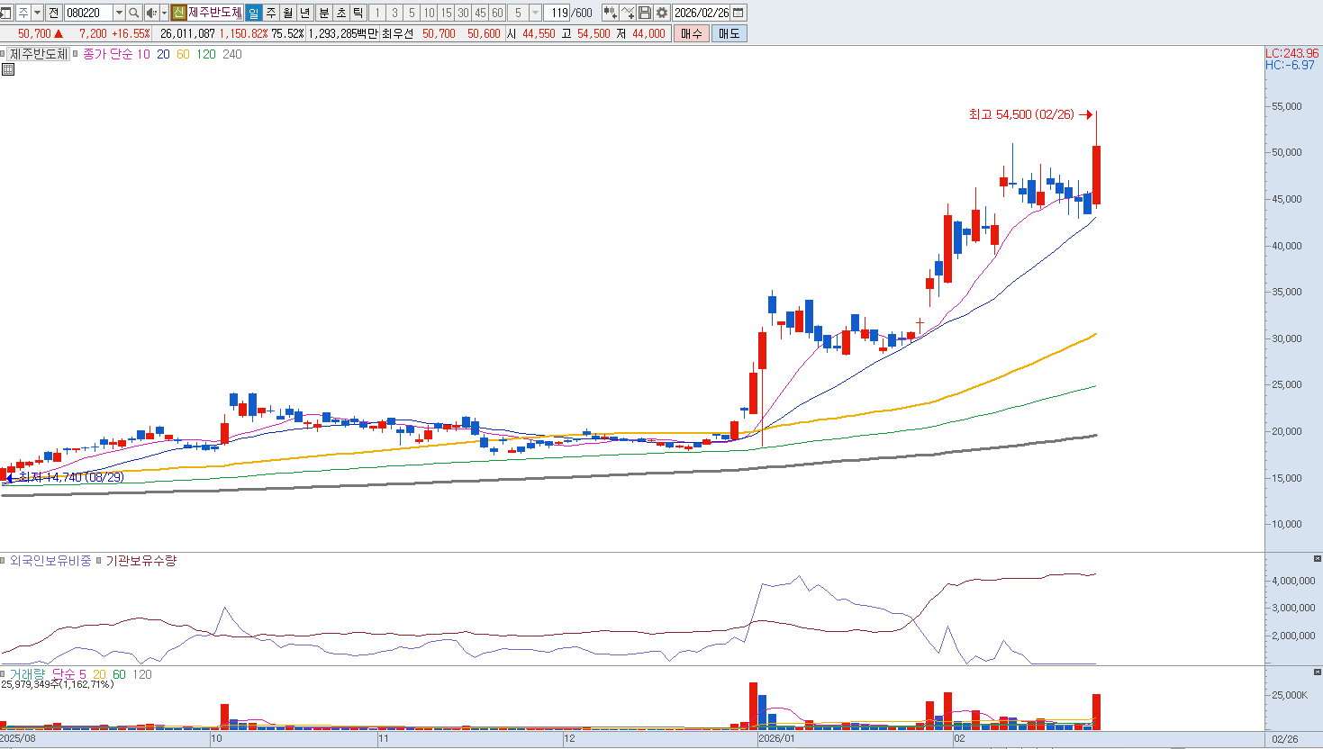 2. 기술적 과열 지표와 단기 조정 압력 기술적 분석 관점에서 제주반도체는 2026년 2월 중순 51,000원이라는 역사적 신고가를 기록한 이후, RSI(상대강도지수)가 과매수 권역에 진입하며 강력한 매도 신호를 보내고 있습니다. 20일 이동평균선(약 40,700원) 이탈 시 투매 물량이 쏟아질 수 있는 수급적 불균형 상태에 놓여 있습니다. 특히 최근 급등 과정에서 대규모 개인 매수세가 유입되며 신용 융자 잔고가 높아진 점은 주가 하락 시 반대매매로 인한 낙폭 확대를 야기할 수 있는 시한폭탄과 같습니다. 의미 있는 지지선인 30,000원 초반대까지의 기술적 조정은 불가피해 보입니다.